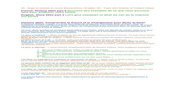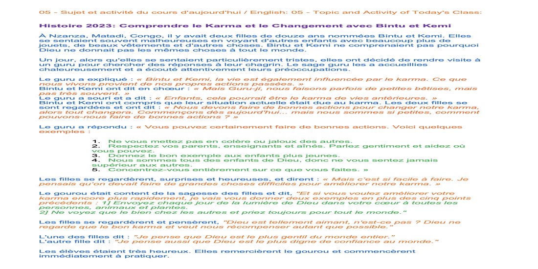 | 04-336sa August 17, Nzanza Ssssb class [6e] | Histoire 2023: Comprendre le Karma et le Changement avec Bintu et Kemi [parti2] / Donnons des exemples de ce que nous pouvons faire pour améliorer notre karma | New Congo Ssssb class, 6th class | Ssssb-gurus Mephia Dilua Ma'am. Support from Exaucé Ngonde Daju And Blancard Daju | Congo 15:00 - 16:30 | Saturday Ssssb Nzanza Class |