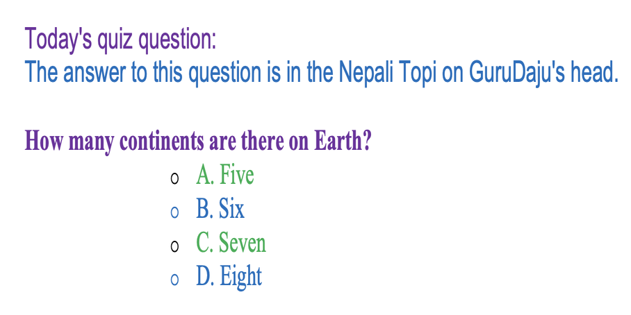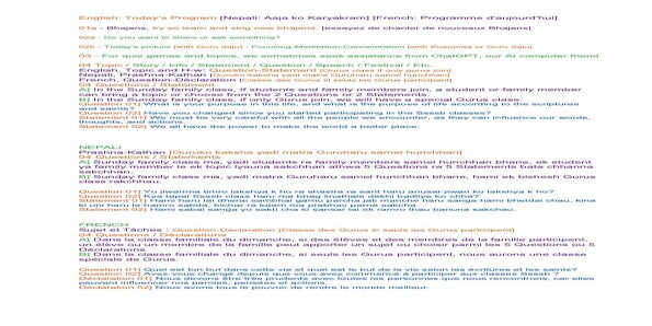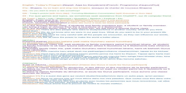 | 04-330su [F] August 04 2024. Family class [2+2] | 2/2 Question/Statement or Gurus class. Aarushi, Question 2] We do not know who we were in our past lives. What do you want to be in your present life and in your future life? | Let's share our experiences and insights through words and/or creative expression, such as art, poetry, music, drama, or drawings, to inspire each other. | Ssssb-guru Daju (Sunil Marapin) Support team: Gurus and Youth team | Nepal 18:45-20:00, India 18:30-19:45, Congo: 14:00-15:15, Holland 15:00-16:15 | Sunday [F] |