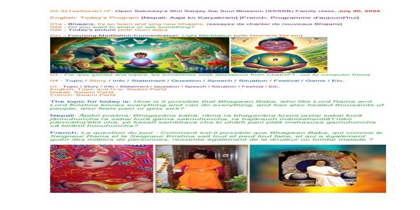 | 04-321 sa July 20 [5-9+F] | Swami, Part 2 | Let's share our experiences and insights through words and/or creative expression, such as art, poetry, music, drama, or drawings, to inspire each other. | Ssssb-guru Daju (Sunil Marapin) Support team: Gurus and Youth team | Nepal 09:00 - 10:15, Congo 4:15-5:30, India 8:45-10:00, Holland 5:15-6:30 | Saturday [5-9 and F] Balkot+Online |