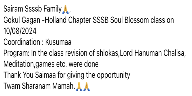 | August 10, 2024 Gokul Gagan | Ssssb class | Kusumaa | Gokul Gagan [Holland Chapter] | ||