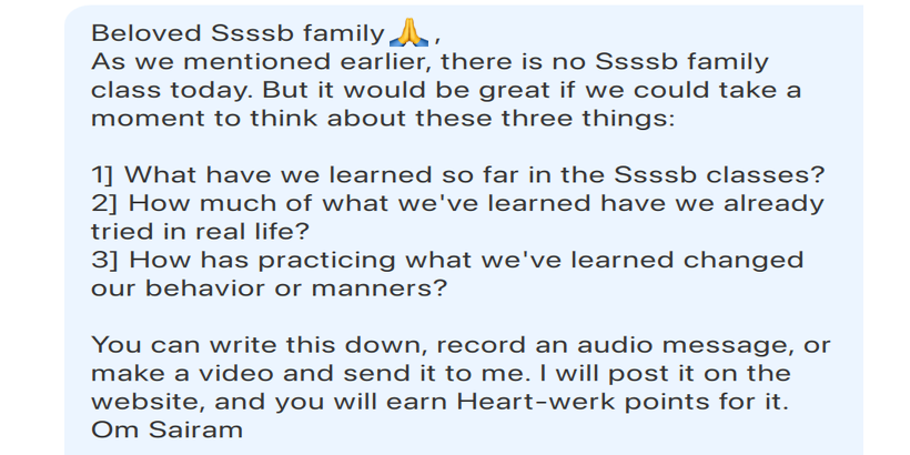 | 04-344su[F] September 01 2024. Family class [2+2] | 2+2: S2 ... | Let's share our experiences and insights through words and/or creative expression, such as art, poetry, music, drama, or drawings, to inspire each other. | Ssssb-guru Daju (Sunil Marapin) Support team: Gurus and Youth team | Nepal 18:45-20:00, India 18:30-19:45, Congo: 14:00-15:15, Holland 15:00-16:15 | Sunday [F] |