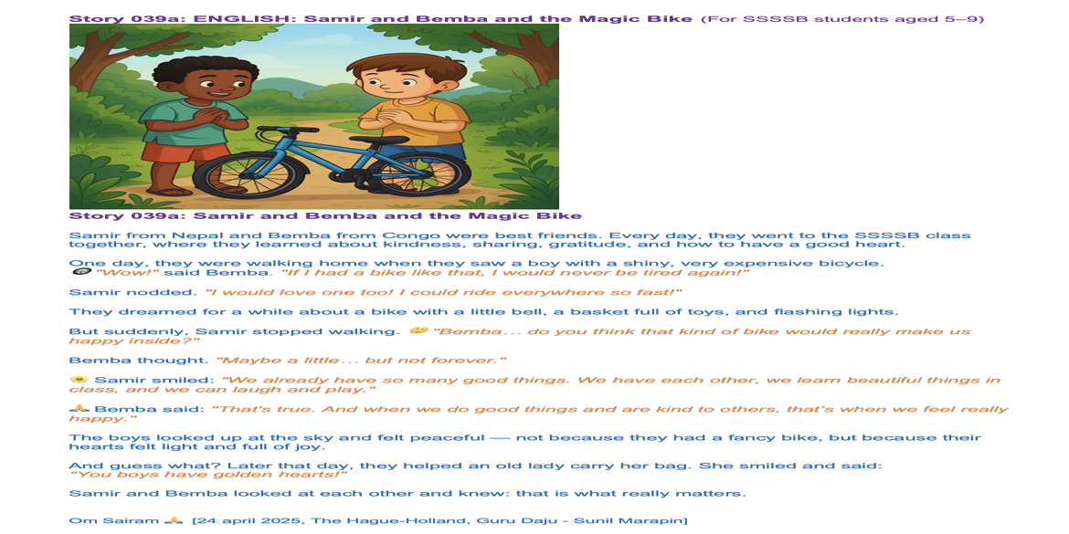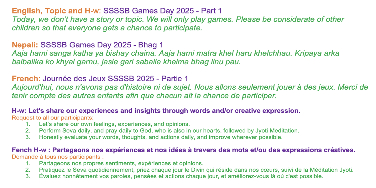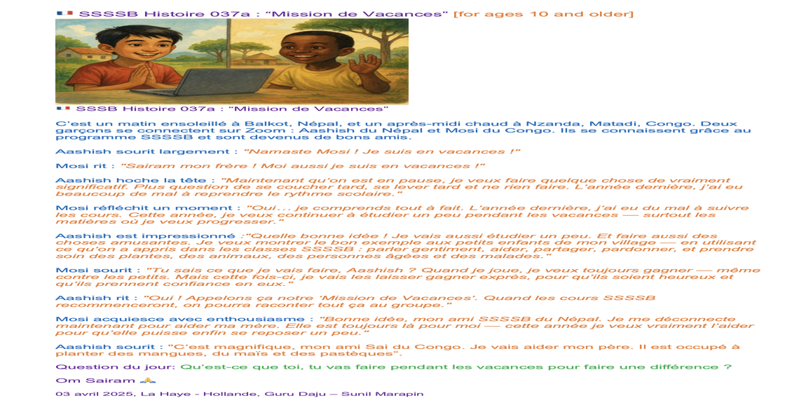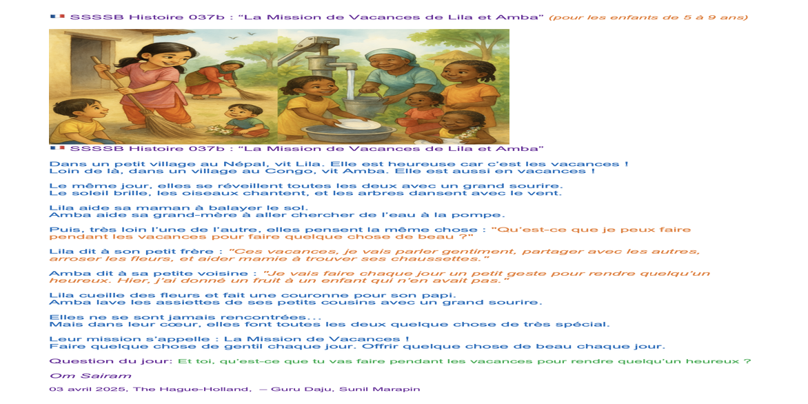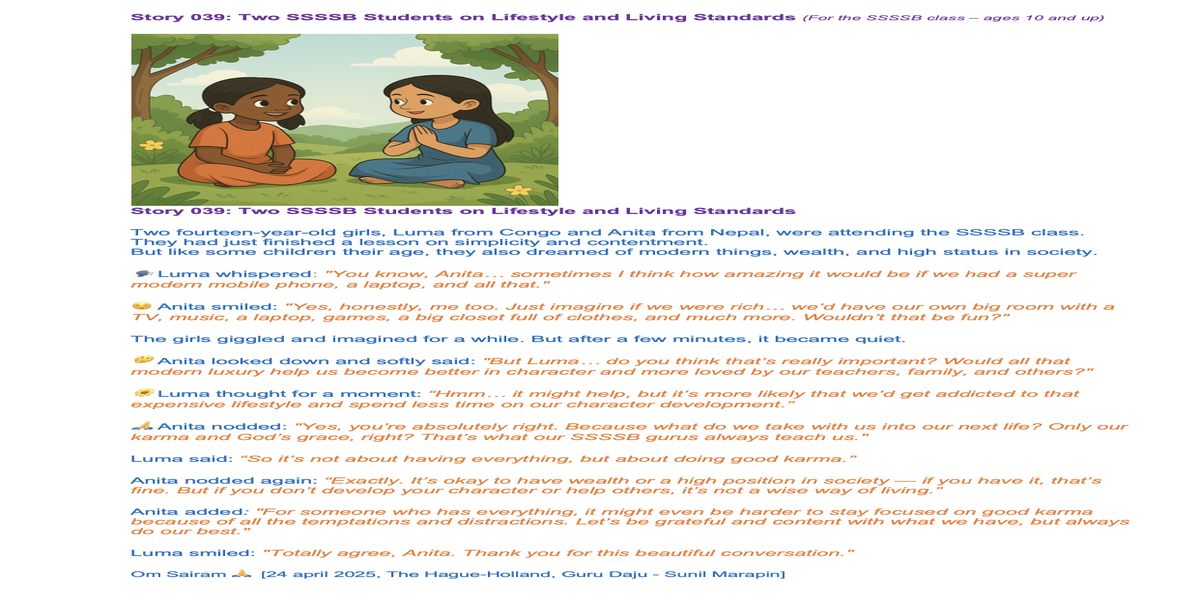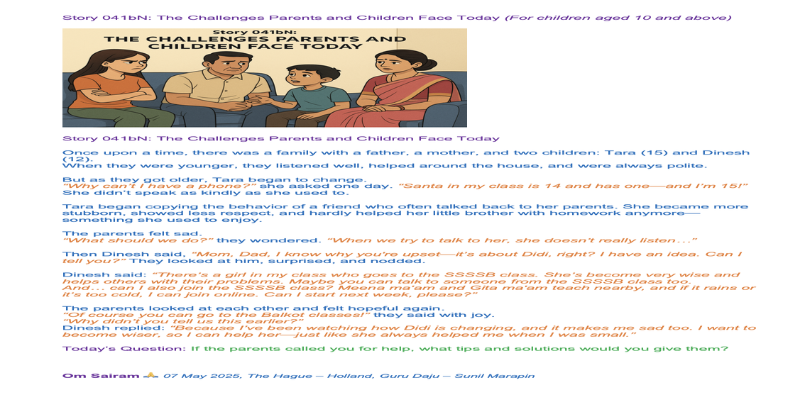 | Saturday April 05 | 429 05 April 2025, online family class. 9:00 nepal time | Story 2037a+b | Ssssb-guru Meena Ma'am, Gita Ma'am and Ssssb-guru Daju | Online Gurus team |