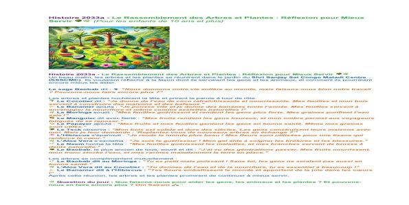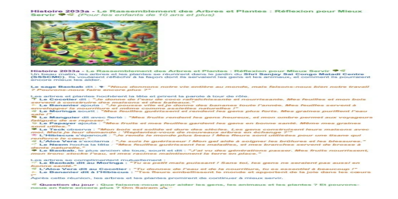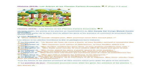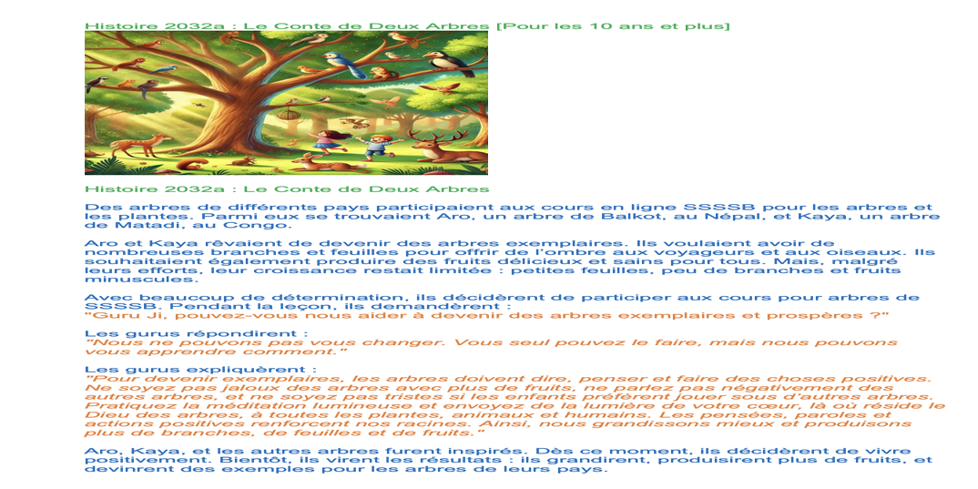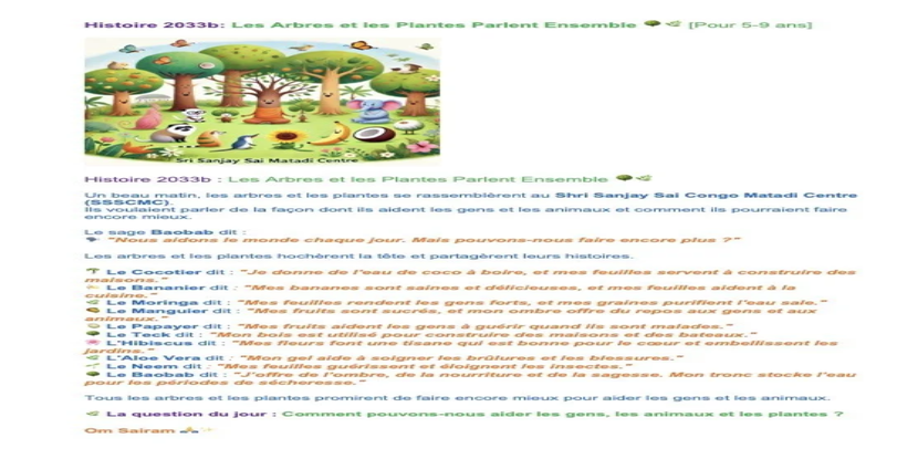 | Sunday Febr. 02 | 411 C2 IsaSai class | Histoire 2032a : Le Conte de Deux Arbres / Histoire 2032b : Aro et Kaya, Deux Arbres d’une Forêt | Church teachers-team, Ssssb-guru Merphia Ma'am Ssssb-gurus team | |