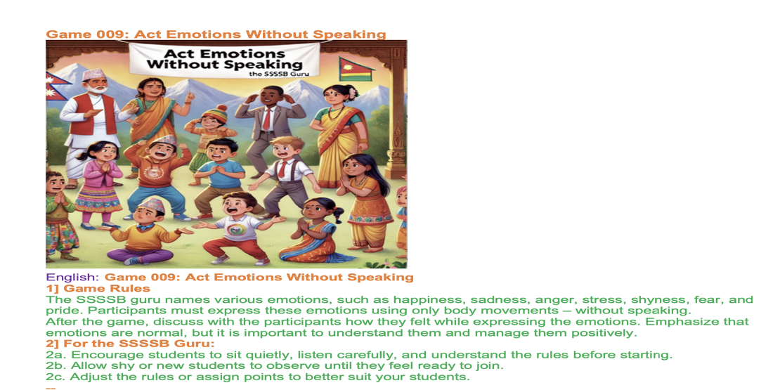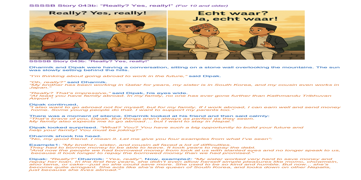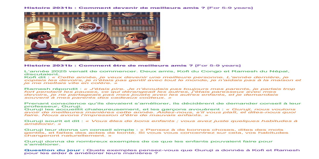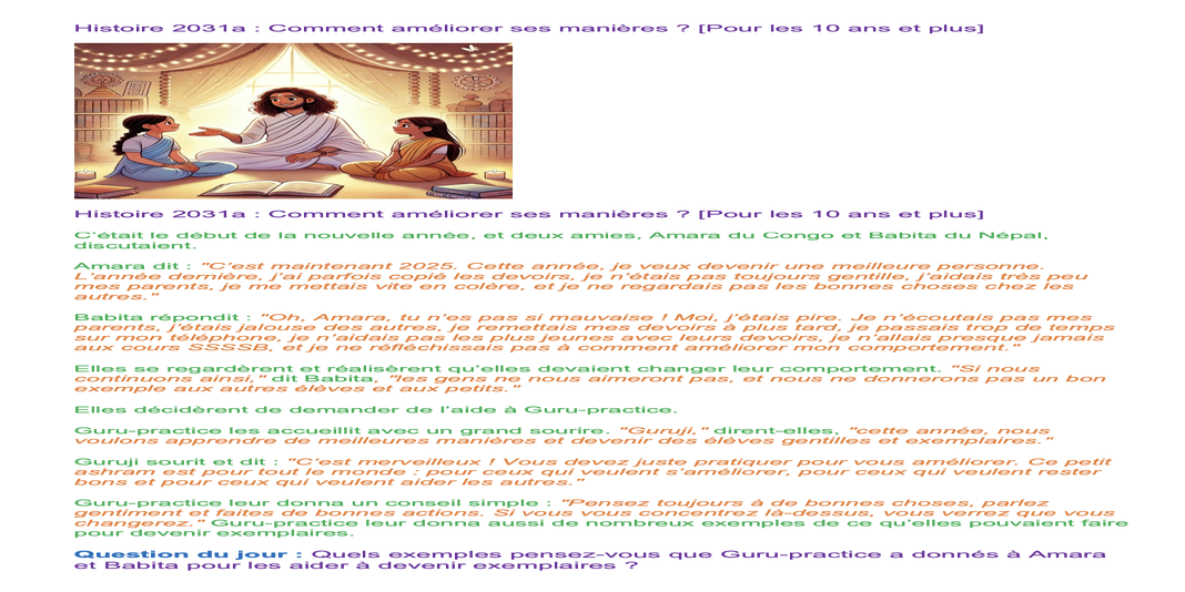 | Saturday Jan 25 | 405 sa[5-9+F] [Nepal 09:00-10:15, Holland 05:15-06:30] | Story 2031a: How to Improve Manners? Story 2031b: How to Be Better Friends? | Ssssb-guru's and active students team. | |