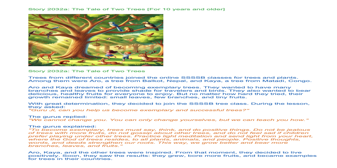| Saturday Febr 01 | 409 sa[5-9+F] [Nepal 09:00-10:15, Holland 05:15-06:30] | Story 2032a: The Tale of Two Trees / Story 2032b: Aro and Kaya, Two Trees from a Forest | Ssssb-guru's and active students team. | |