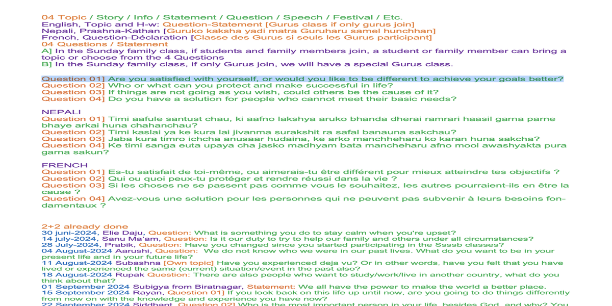 | Sunday Jan 12 [1e Sunday 2025 family class] | 401 su[2+2,F] [Family class [Nepal 18:45-20:00, Congo 14:00-15:15] | Bhajan, Games and 2+2 or own topic | Ssssb-guru's and active students team. | |