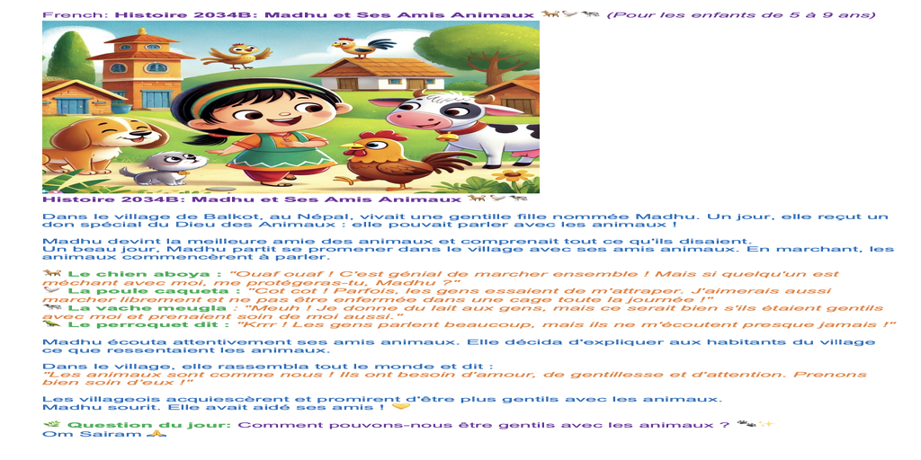 | Saturday Febr 22 | 420 sa[5-9+F] [Nepal 09:00-10:15, Holland 05:15-06:30] | Story 2034a+b Madhu and the Animals | Ssssb-guru's and active students team. | |