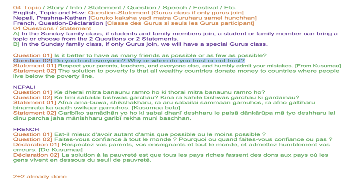 | Saturday May 17 | 443 balkot+Sa FamClass | Story 042a+b | Meena Ma'am and Gita Ma'am. Support from the online present Gurus. | |
