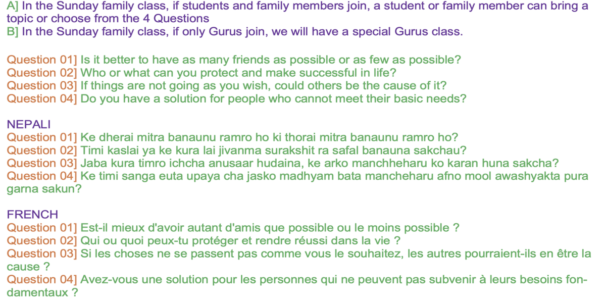 Sunday Family Class Times: Nepal: 19:00 - 20:00 India: 18:45 - 19:45, Holland: 15:15 - 16:15, Congo DR: 14:15 - 15:15