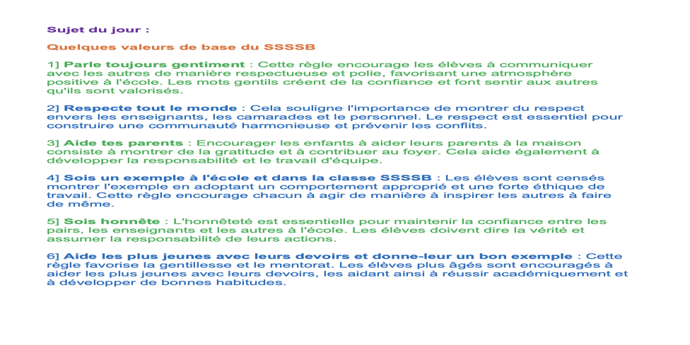 | Saturday March 01 | 423 C1-31 [Ssssb class] [Congo 15:00-16:30] | Basis Ssssb values to grow | Ssssb-guru Merphia Ma'am and Ssssb-guru Daju | |