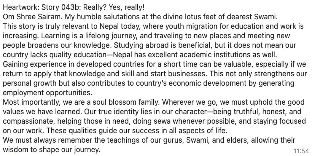 | Saturday March 29 | 426 29 March 2025, online family class. 9:00 nepal time | Story 2036a+b | Ssssb-guru Meena Ma'am, Gita Ma'am and Ssssb-guru Daju | |