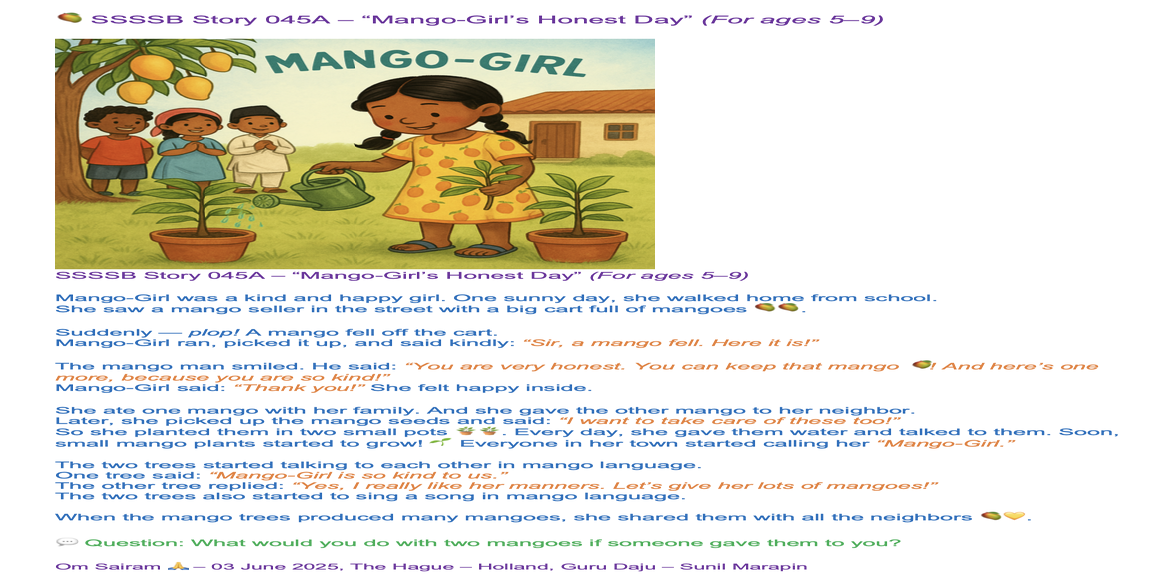 | Sunday June 08 | 451 SuFamCla | Story 045b Mango Girl | Support from the online present Gurus. |