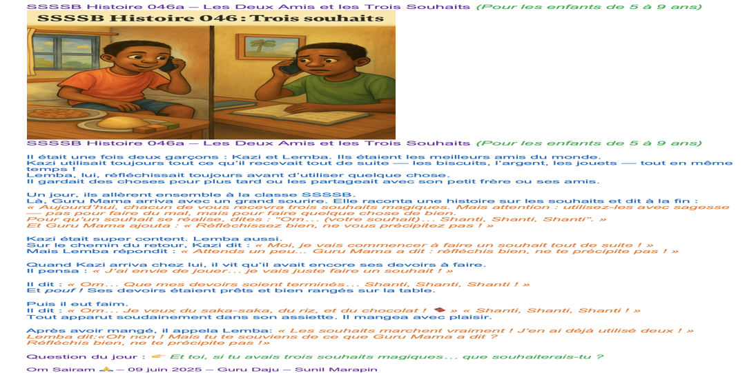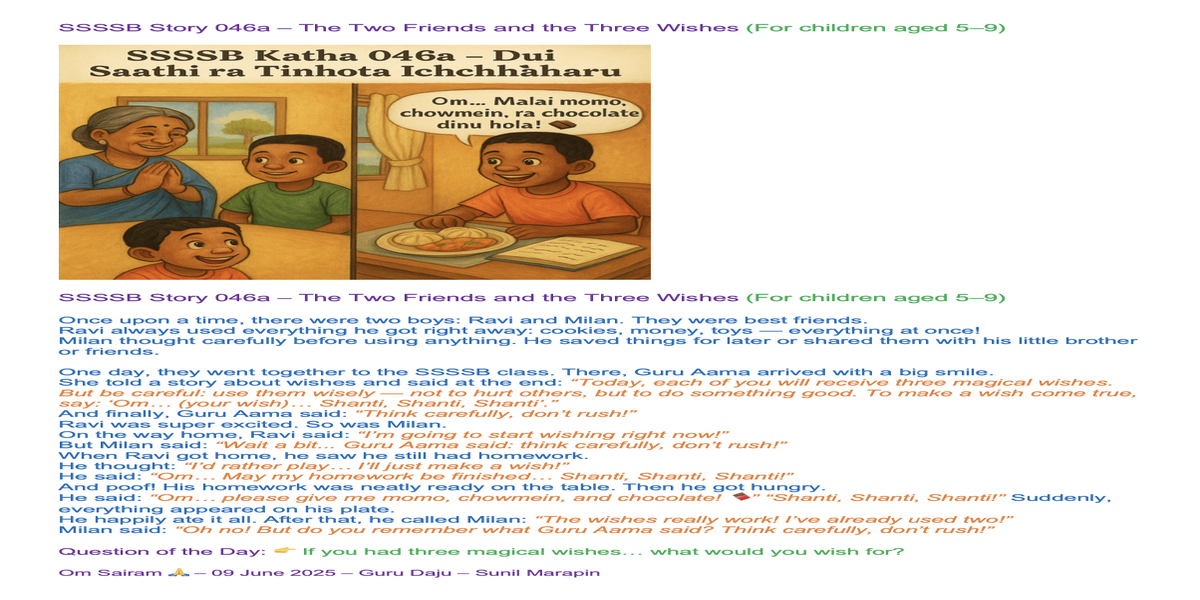 | Saturday June 14 | 452 balkot+Sa FamClass | Story 046a+b [3 wishes] | Meena Ma'am and Gita Ma'am. Support from the online present Gurus. | |