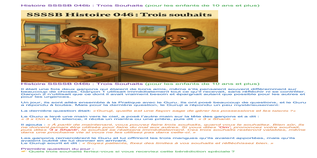 | Sunday June 15 | 454 SuFamCla | Story 046b [3 wishes] | Support from the online present Gurus. | |