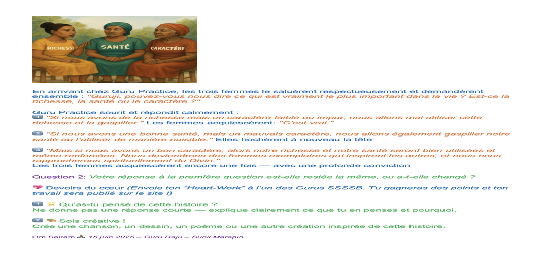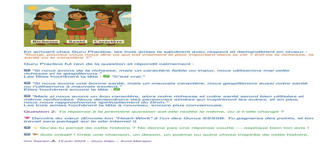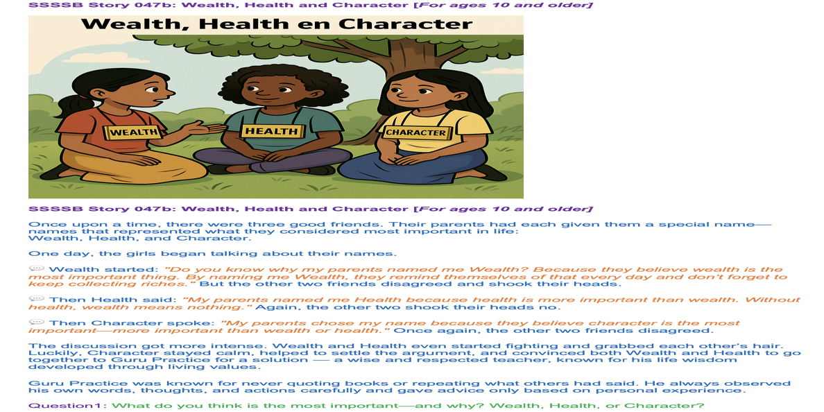 | Saturday June 21 | 455 balkot+Sa FamClass | Story 047a+b, Wealth, Health and Character | Meena Ma'am and Gita Ma'am. Support from the online present Gurus. | |