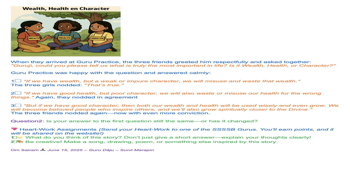 The program includes bhajans, light meditation, games, and topics from daily life, with a focus on building self-confidence, creativity, and putting Swami's values into practice to transform ourself. Each week, SSSSB-Guru Daju (Sunil Marapin) creates a new, unique SSSSB program, which serves as the foundation for the online family class on Saturday, the two physical Balkot classes, and the two physical classes in DR Congo.