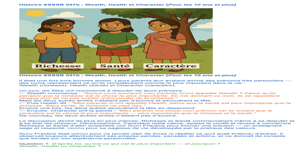 | Sunday June 22 | 458 SuFamCla | Story 047b, Wealth, Health and Character | Support from the online present Gurus. |