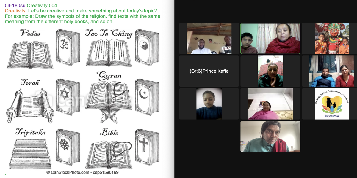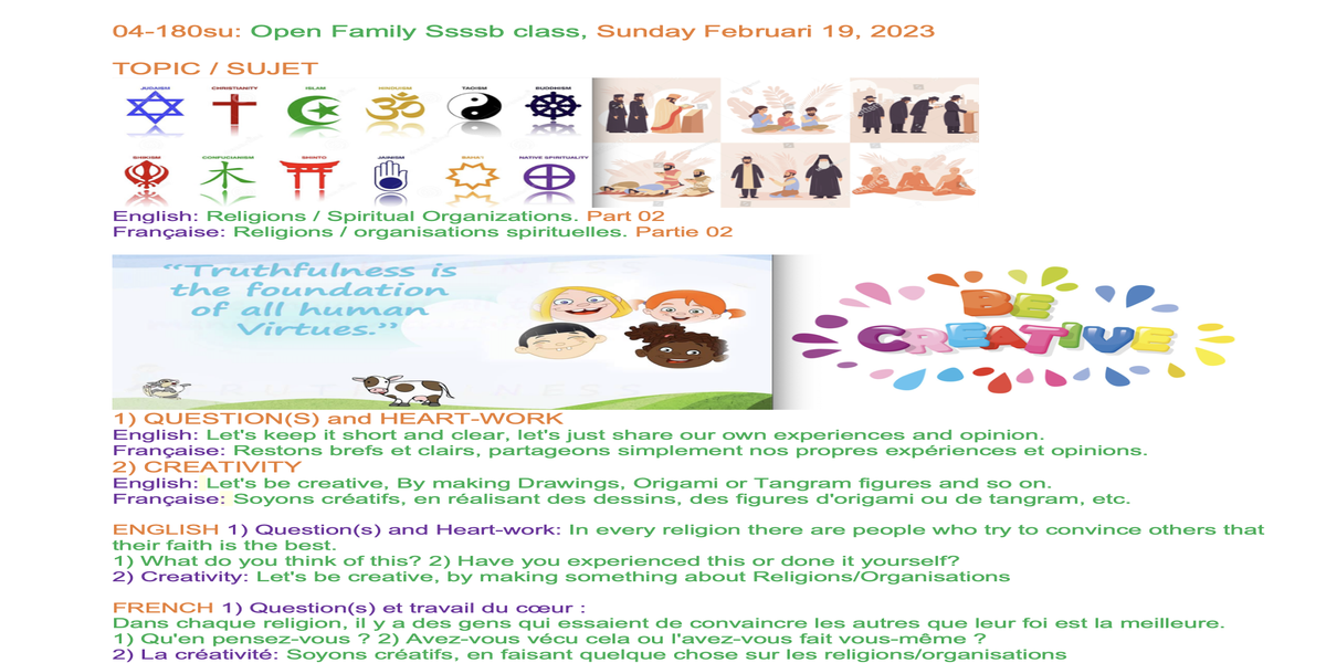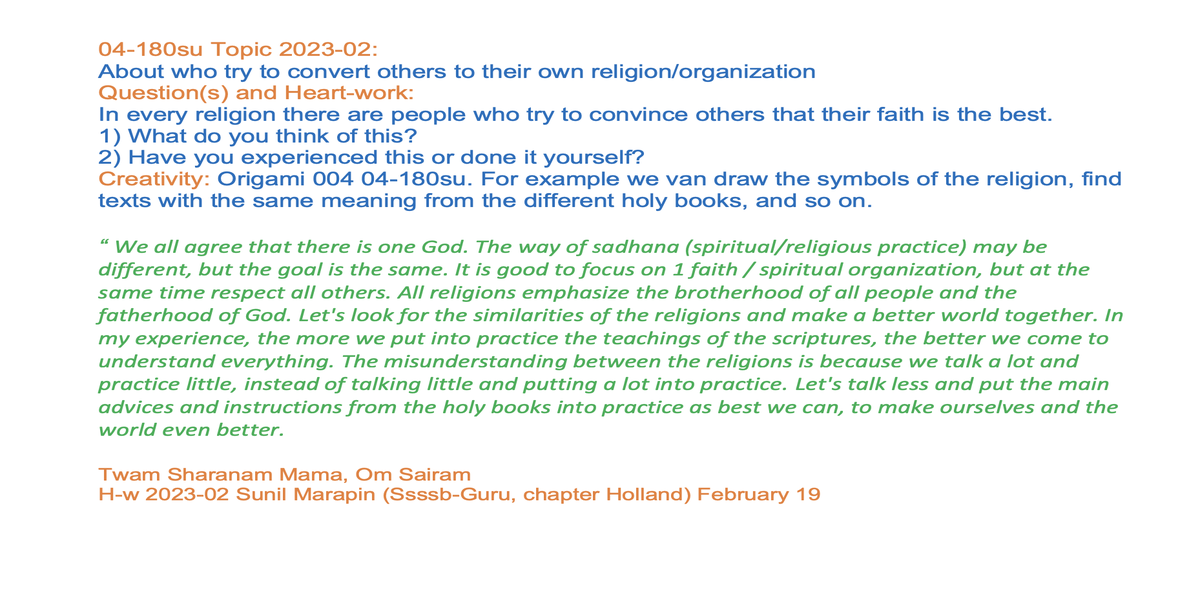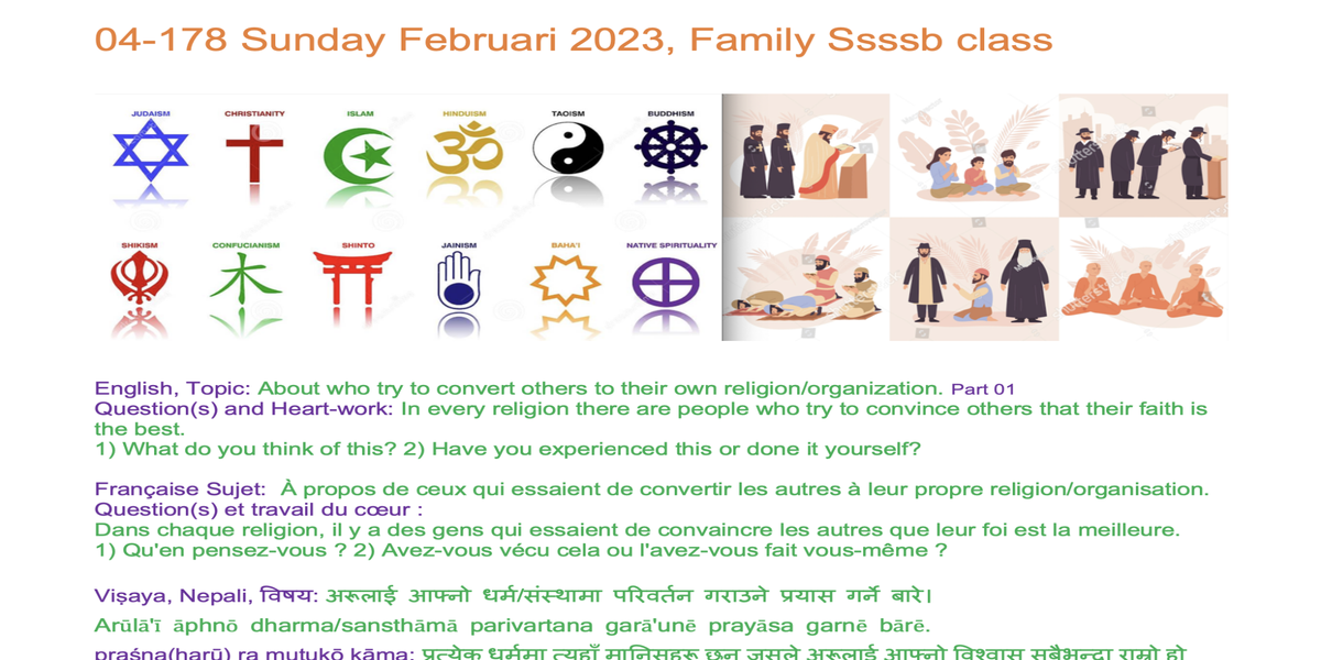 | 04-180 | Why poeple try to convert others to their own religion/organization? Part 02 | In every religion there are people who try to convince others to their own religion/organisation. 1) What do you think of this? 2) Have you experienced this or done it yourself? | For example: Draw the symbols of the religion, find texts with the same meaning from the different Holy books, and so on | Sunil Marapin | Already done: 2023-February 19, Sunday SSSSB Family class |