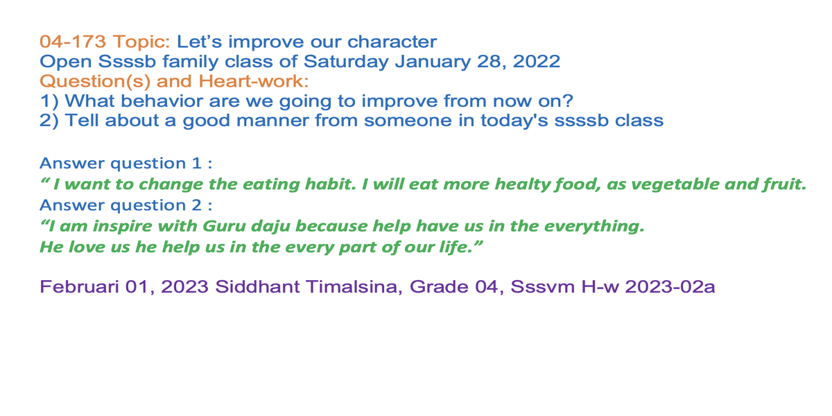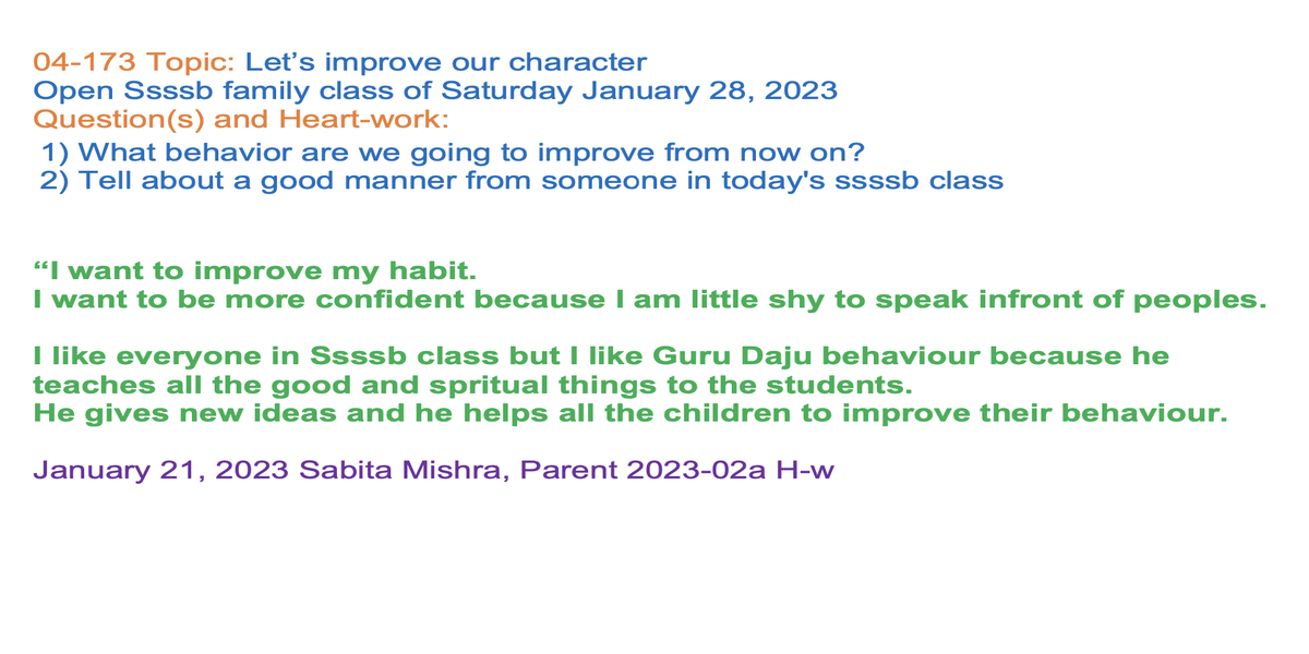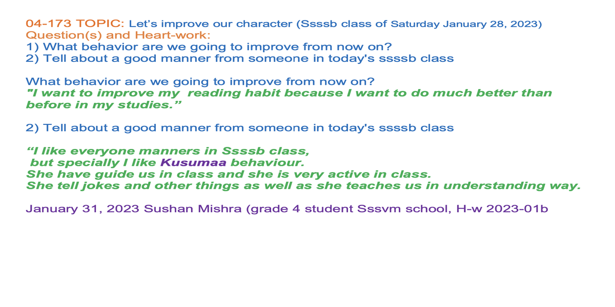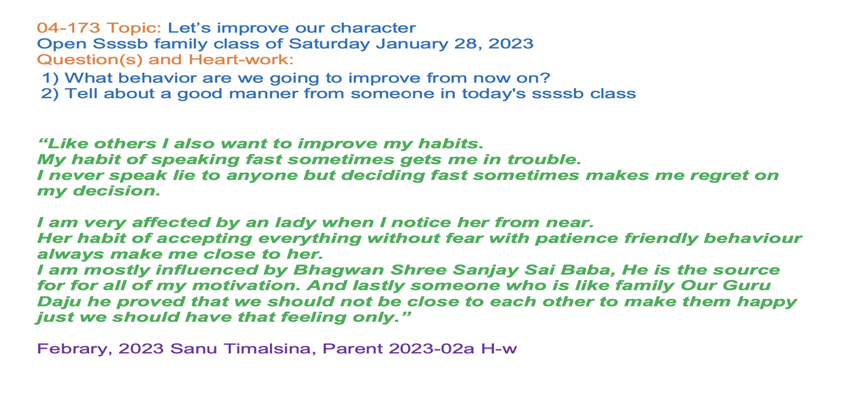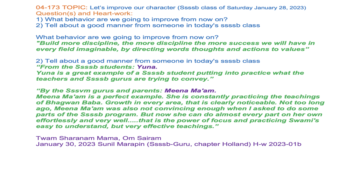 | 04-173 (04-122) | Let’s improve our character | 1) What behavior are we going to improve from now on? 2) Tell about a good manner from someone in today's ssssb class | Sunil Marapin | Already done: 2023-January 28, Saturday SSSSB Family class | |