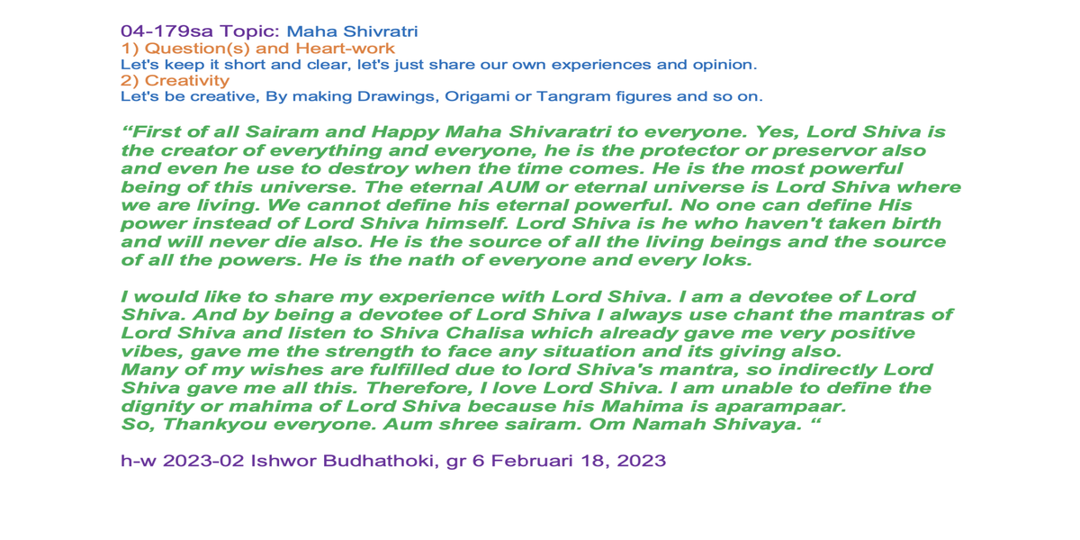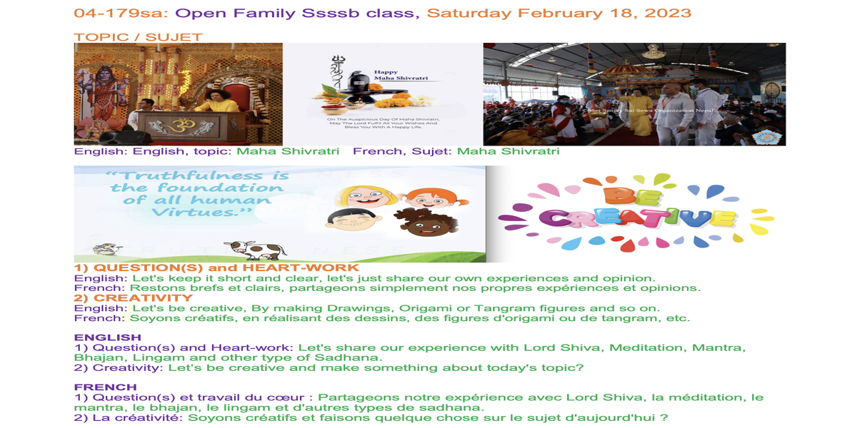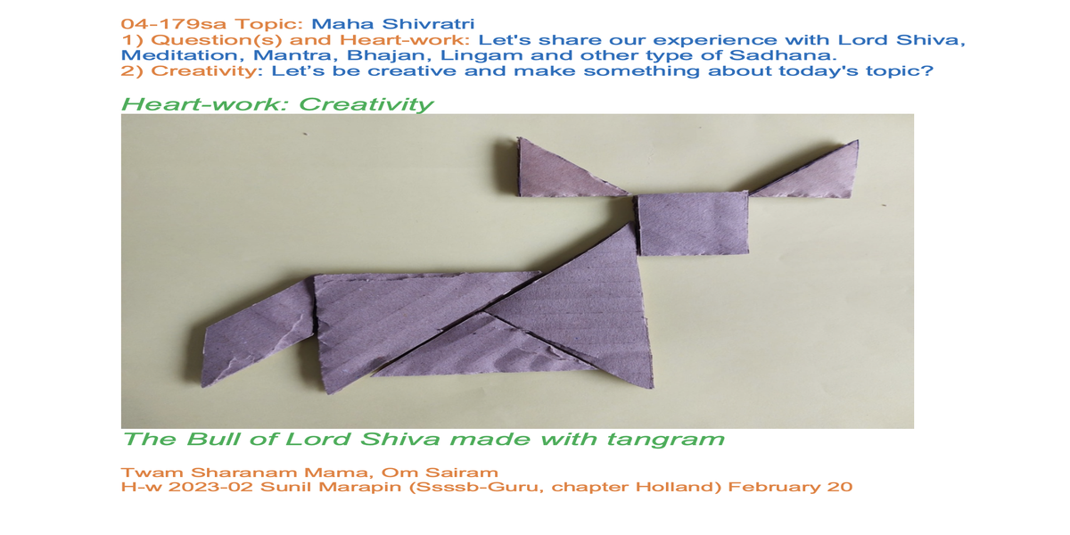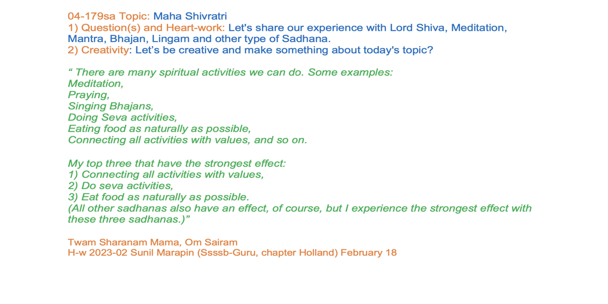 | 04-179 | Maha Shivratri | Let's share our experience with Lord Shiva, Meditation, Mantra, Bhajan, Lingam and other type of Sadhana. | For example: Lord Shiva, Trishul, Dhamru, Kamandalam, Serpent and so on. | Sunil Marapin | Already done: 2023-February 18, Saturday SSSSB Family class |