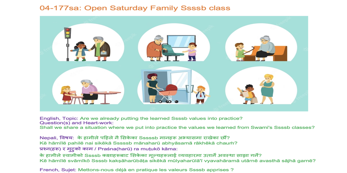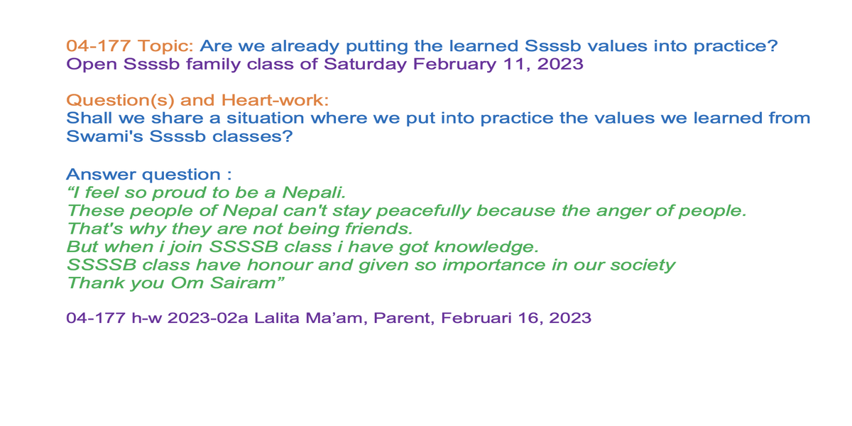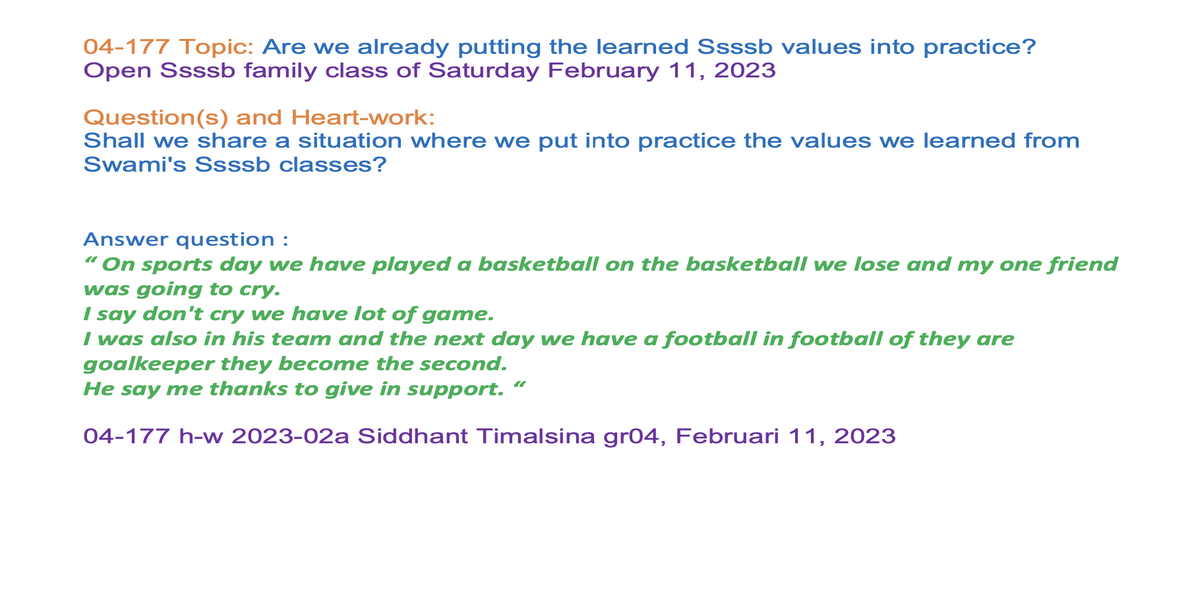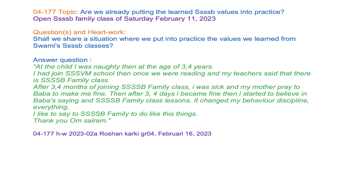 | 04-177 | Are we already putting the learned Ssssb values into practice? | Shall we share a situation where we put into practice the values we learned from Swami's Ssssb classes? | Orgami: Boat | Sunil Marapin | Already done: 2023-February 11, Saturday SSSSB Family class |
