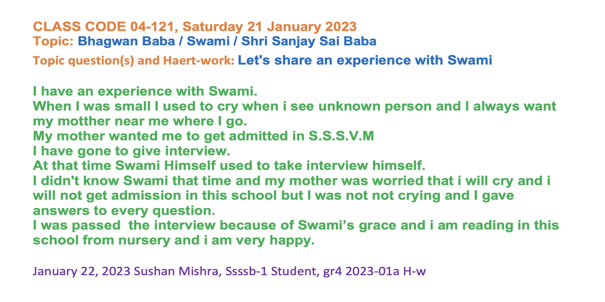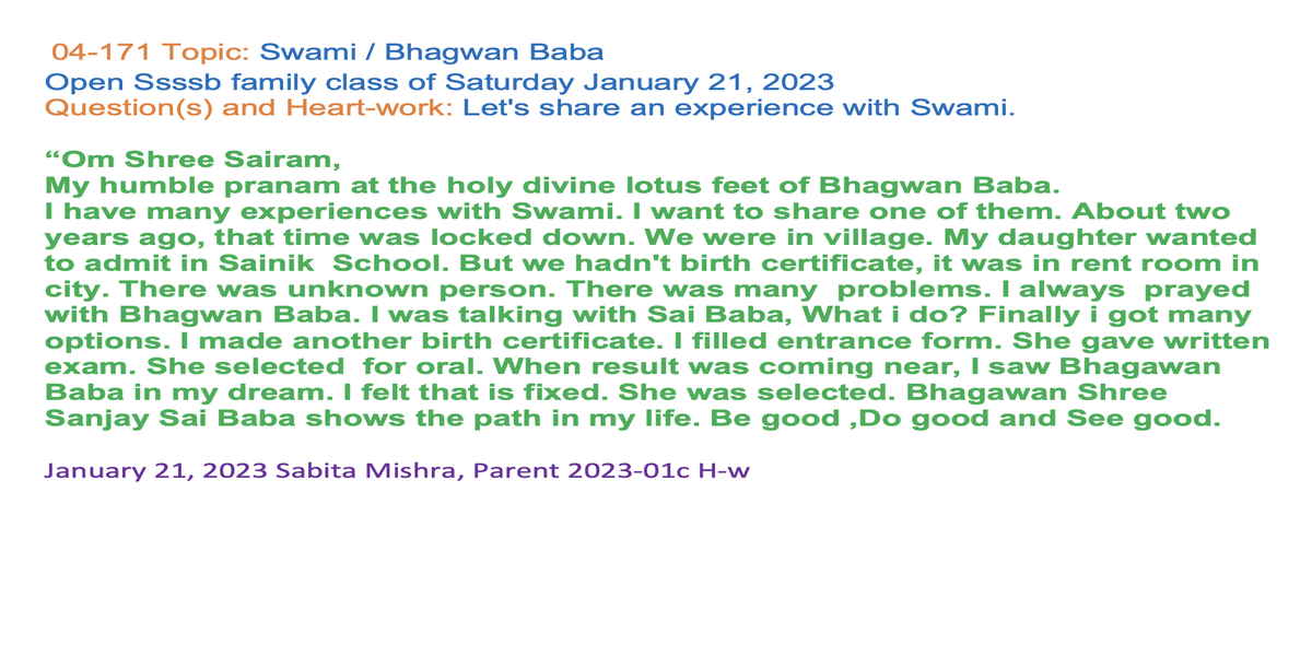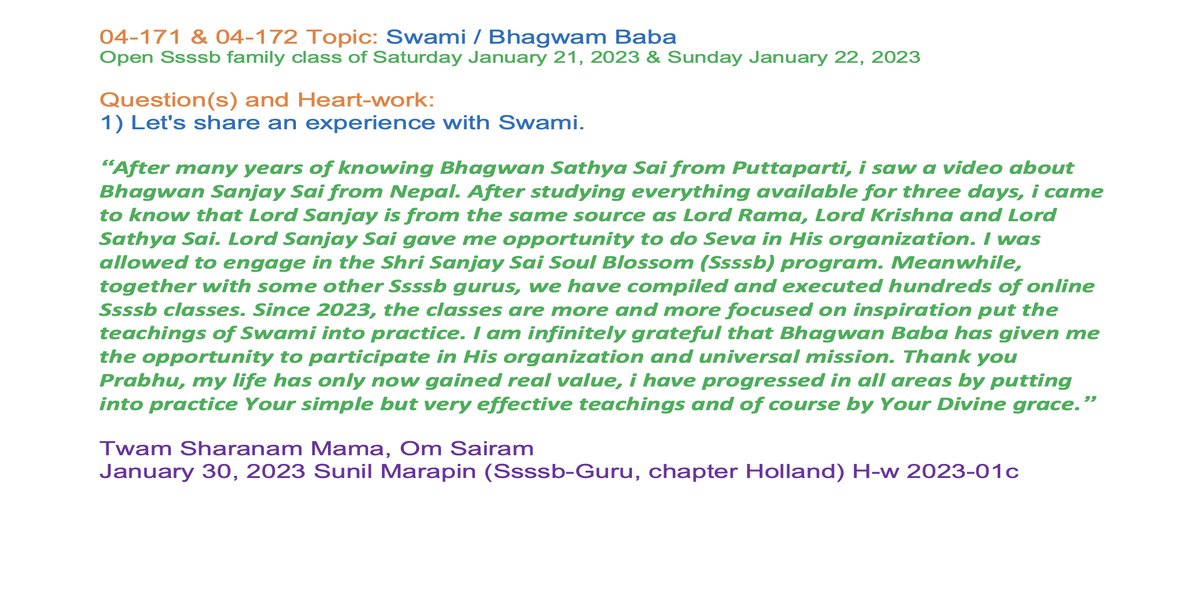 | 04-171 (04-121) | Swami / Bhagvan Baba | Let's share an experience with Swami. | Sunil Marapin | Already done: 2023-January 21, Saturday SSSSB Family class | |
