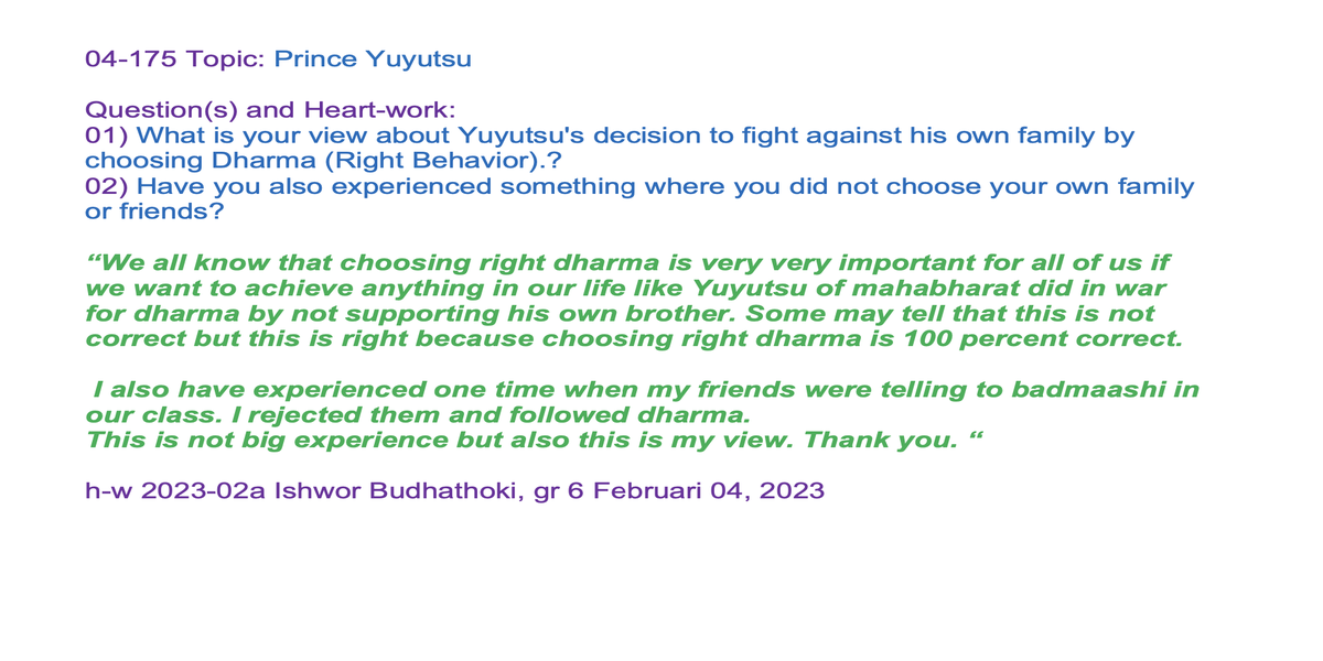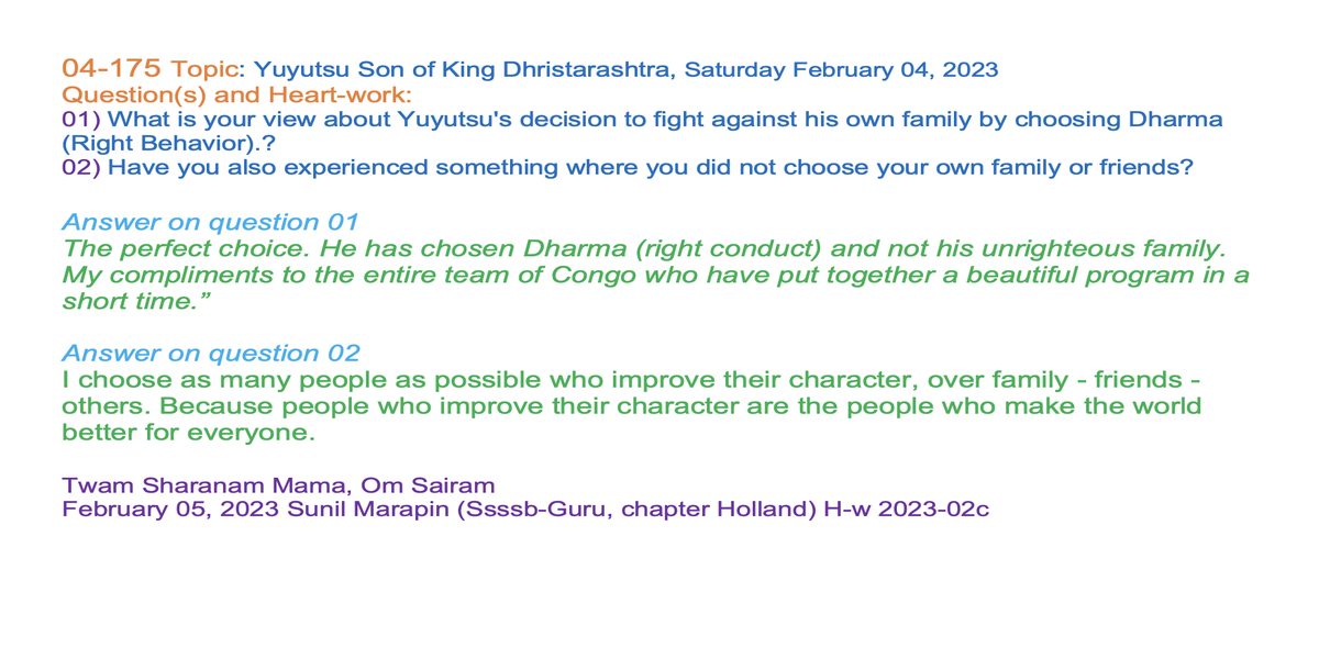 | 04-175 | Yuyutsu Son of King Dhristarashtra and a half-brother to the rest of the Kuru brothers. | 1) What is your view about Yuyutsu's decision to fight against his own family by choosing Dharma (Right Behavior).? 2) Have you also experienced something where you did not choose your own family or friends? | Sunil Marapin | Already done: 2023-February 04, Saturday SSSSB Family class | |