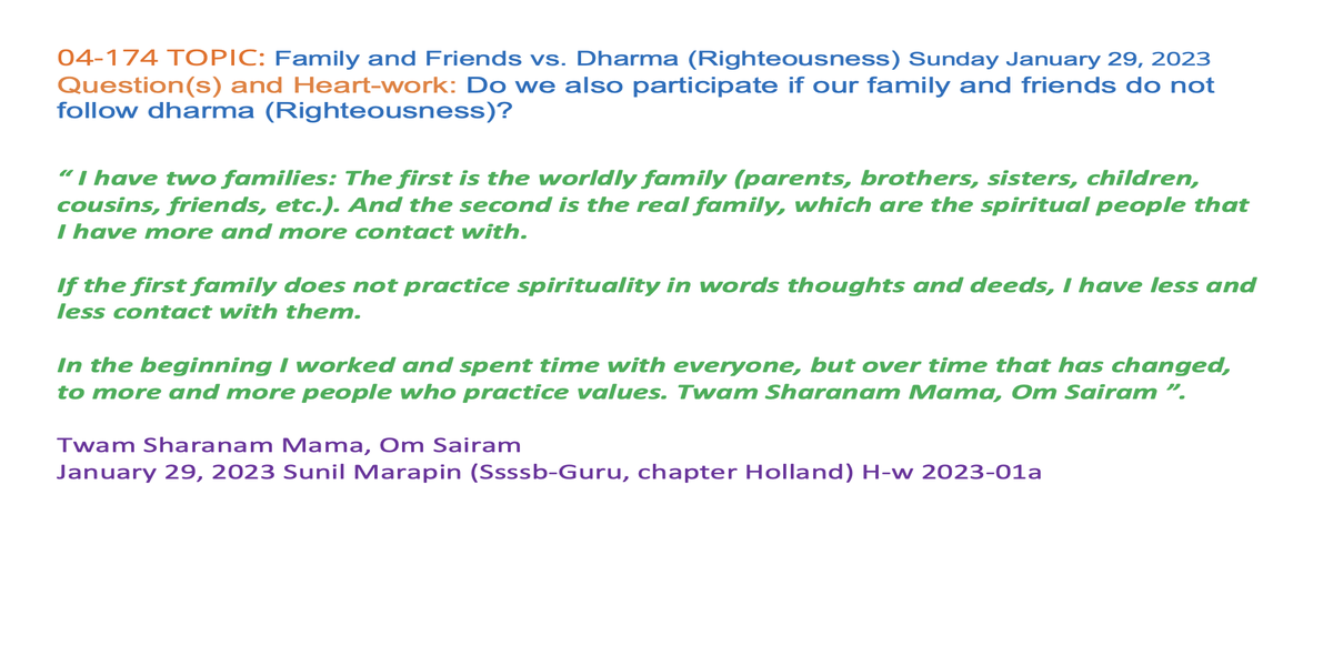 | 04-174 (07-52) | Family and Friends vs. Dharma (Righteousness) | Do we also participate if our family and friends do not follow dharma (Righteousness)? | Sunil Marapin | Already done: 2023-January 29, Sunday SSSSB Family class | |