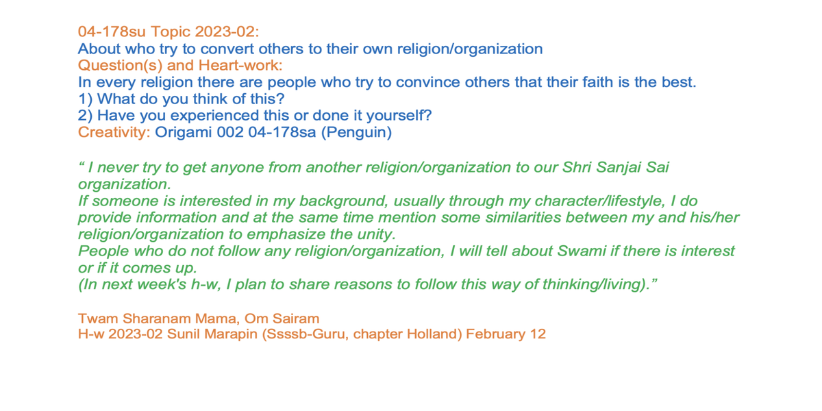 | 04-178 | Why poeple try to convert others to their own religion/organization? Part 01 | In every religion there are people who try to convince others to their own religion/organisation. 1) What do you think of this? 2) Have you experienced this or done it yourself? | Orgami: Penguin | Sunil Marapin | Already done: 2023-February 12, Sunday SSSSB Family class |