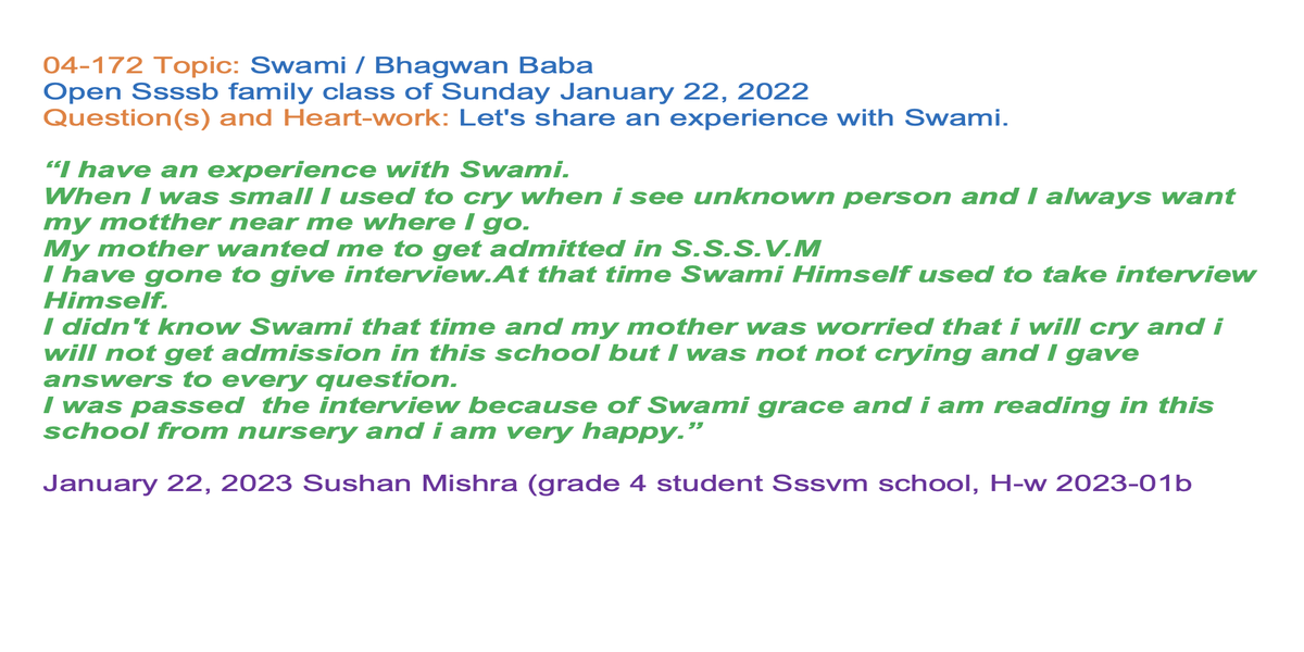 | 04-172 (07-51) | Swami / Bhagvan Baba | Let's share an experience with Swami. | Sunil Marapin | Already done: 2023-January 22, Sunday SSSSB Family class | |