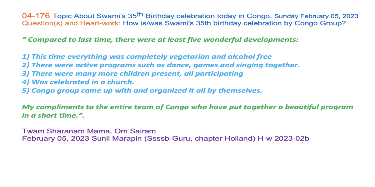 | 04-176 | About Swami’s 35th Birthday celebration today in Congo. | How is/was Swami's 35th birthday celebration by Congo Group? | Sunil Marapin | Already done: 2023-February 05, Sunday SSSSB Family class | |