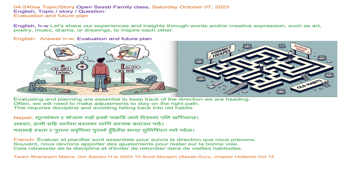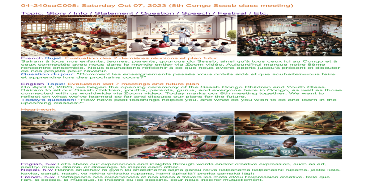 | 04-240saC008 Oct 07, 2023 | Evaluation and future plan | Let's share our experiences and insights through words and/or creative expression, such as art, poetry, music, drama, or drawings, to inspire each other. | Ssssb-guru Daju (Sunil Marapin). Support team: Gurus and Youth team | Congo 14:00- 16:00, India 18:30-20:30 Nepal: 18:45-20:45,Holland 15:00-17:00 | 8e Congo children + youth class. |