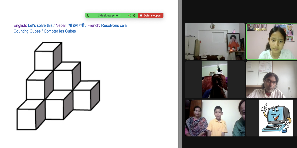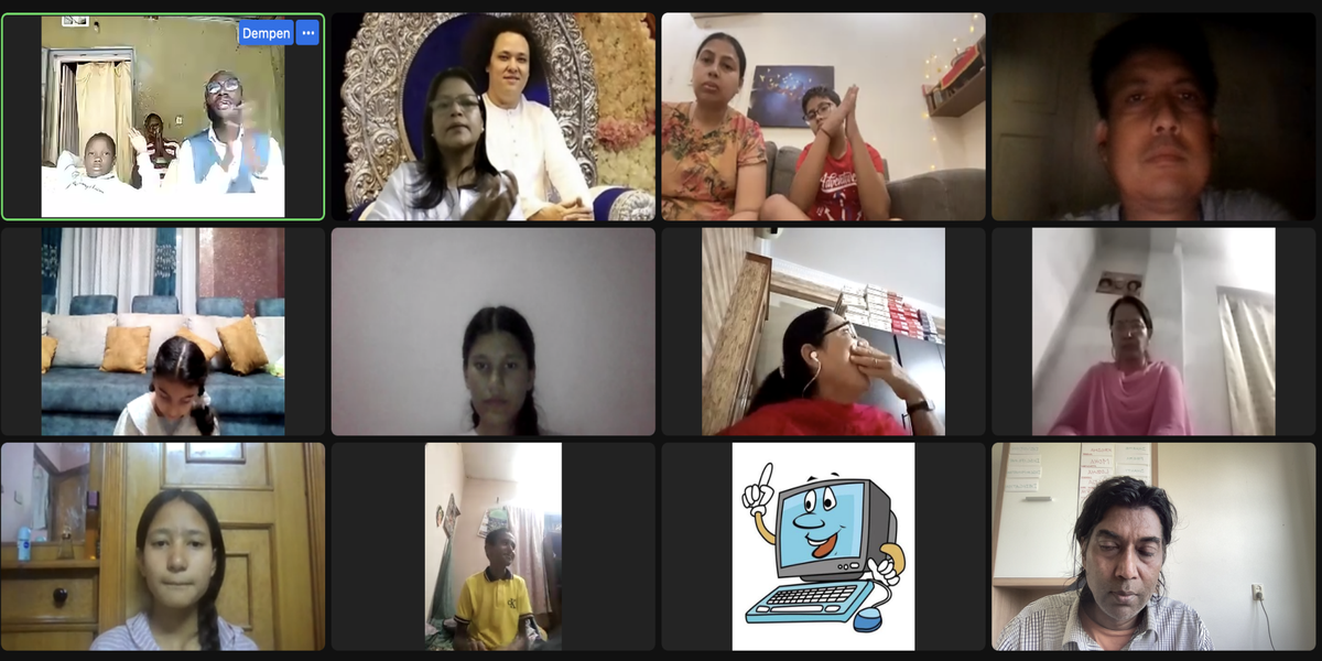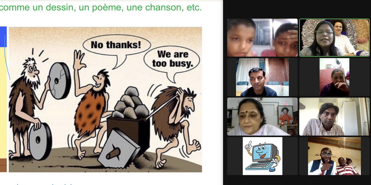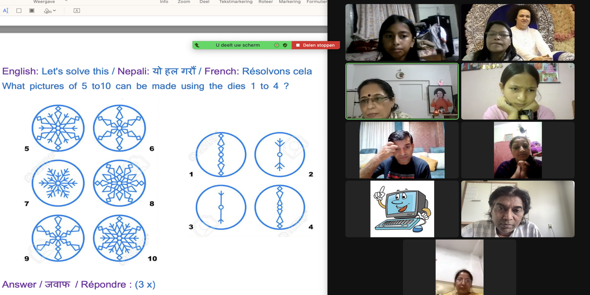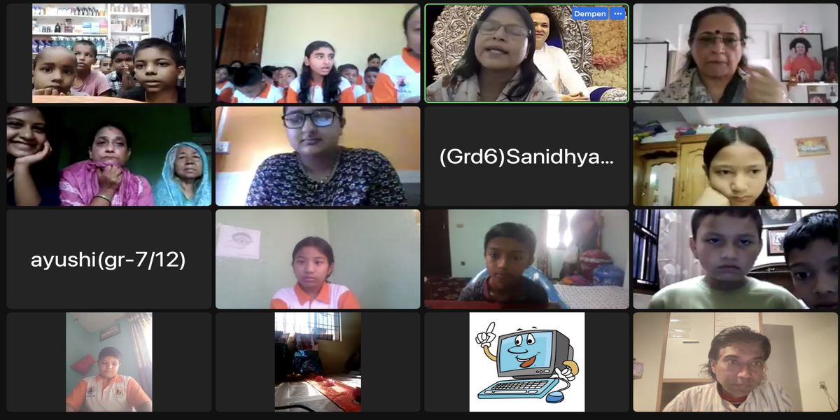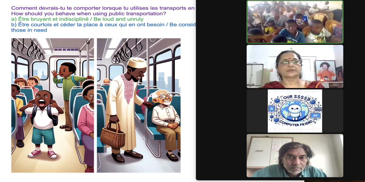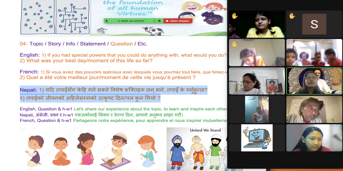 | 04-221C004 Aug 05, 2023 | Story: Amina, an exemplary student. | Let's share our experiences and insights through words and/or creative expression, such as art, poetry, music, drama, or drawings, to inspire each other. | Ssssb-guru Daju (Sunil Marapin). Support team: Gurus and Youth team | Congo 14:00- 16:00, India 18:30-20:30 Nepal: 18:45-20:45,Holland 15:00-17:00 | Congo children and youth class. | 4e Congo children + youth class. |