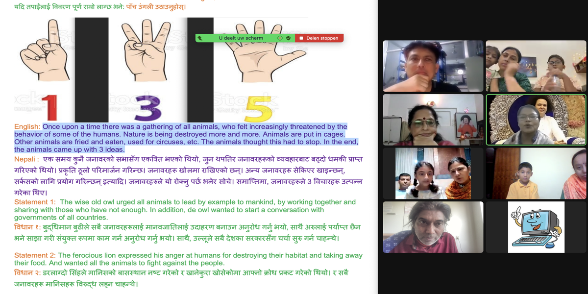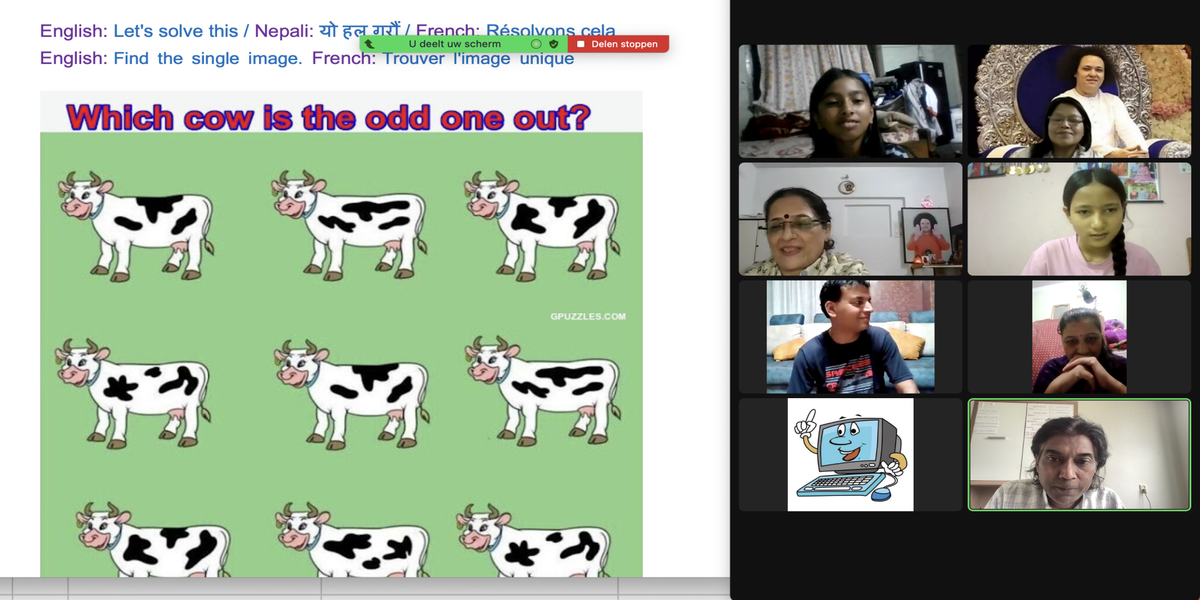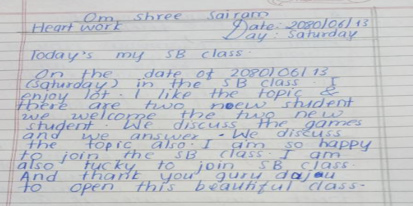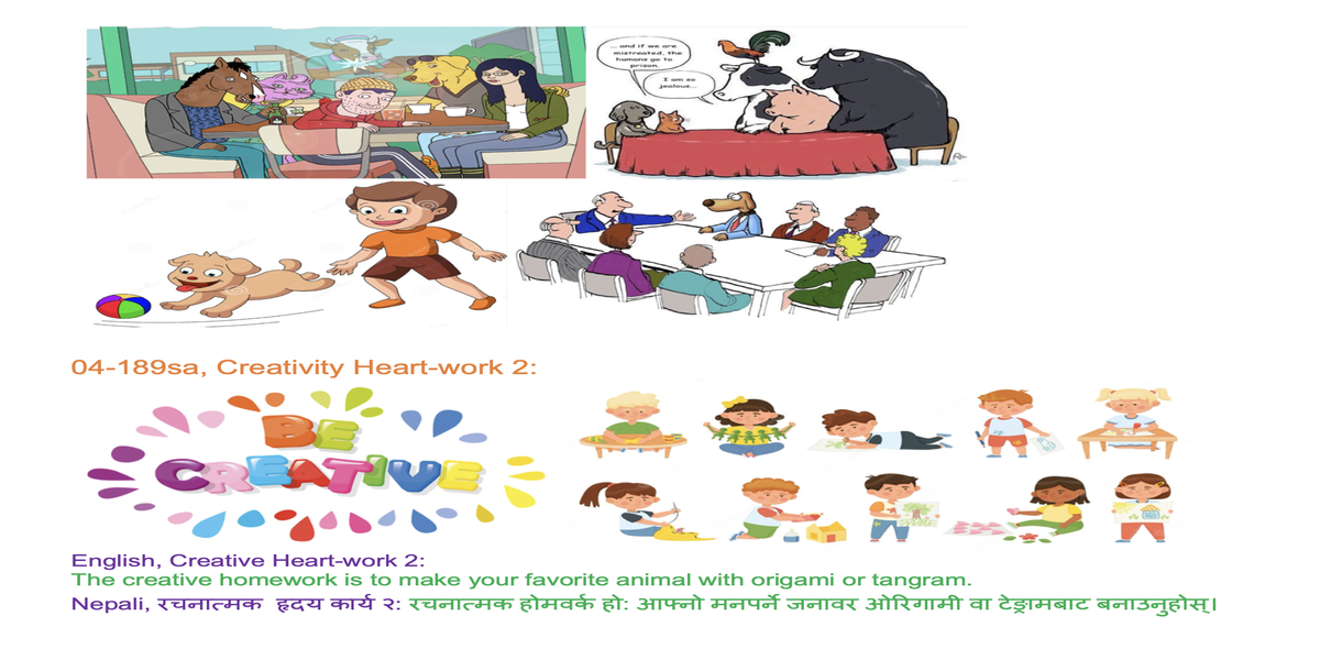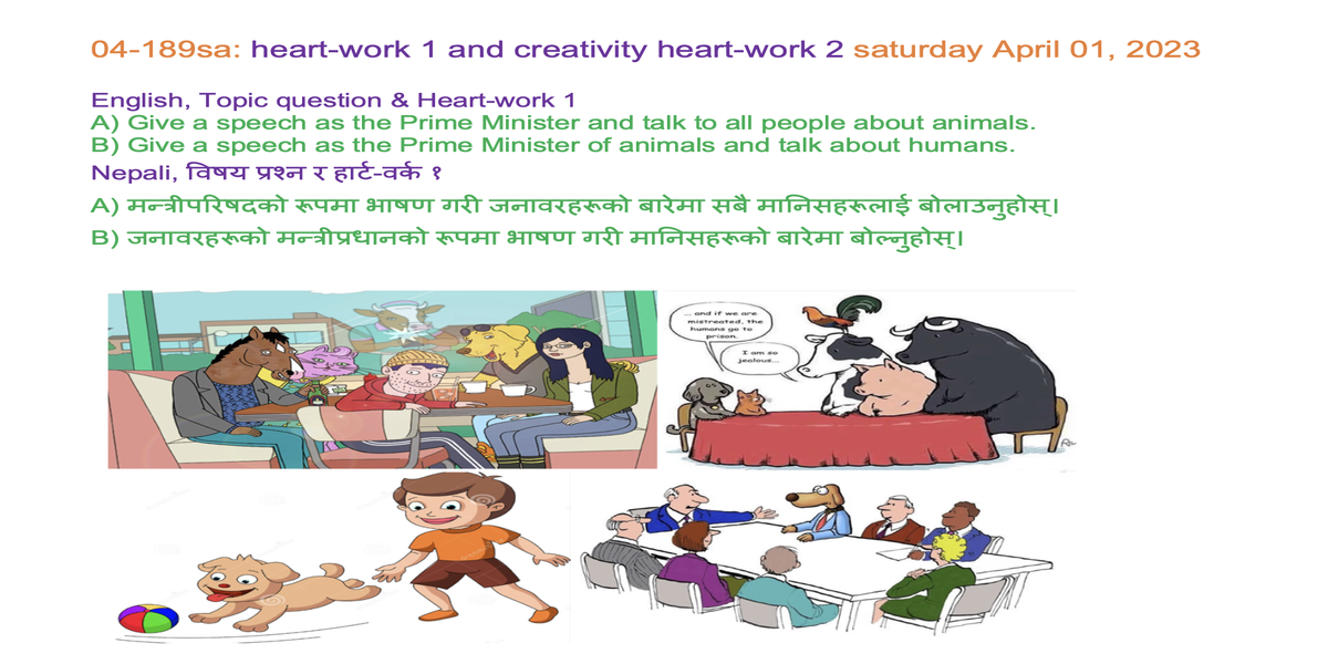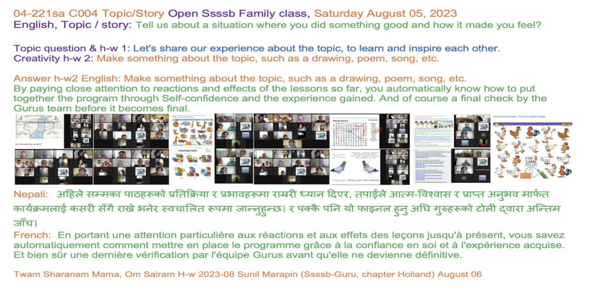 | 04-229su Sept 03, 2023 | program: 04-189sa Animals and Humans Part 2 | Let's share our experiences and insights through words and/or creative expression, such as art, poetry, music, drama, or drawings, to inspire each other. | Ssssb-guru Daju (Sunil Marapin). Support team: Gurus and Youth team | Congo 14:00- 15:15, India 18:30-19:45 Nepal: 18:45-20:00,Holland 15:00-16:15 | Extra class for new Children from Qatar | |