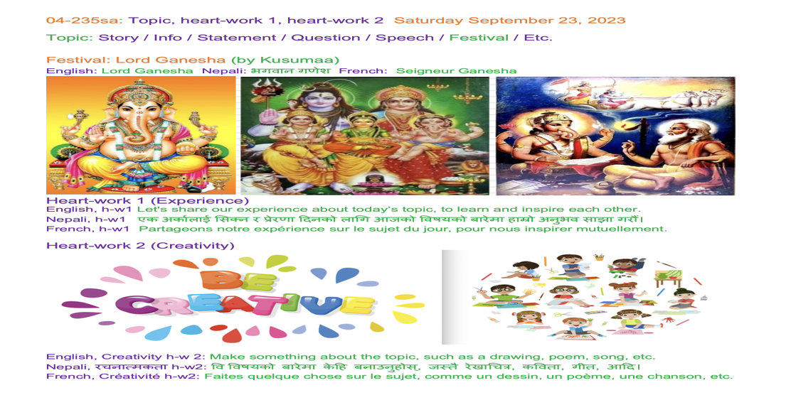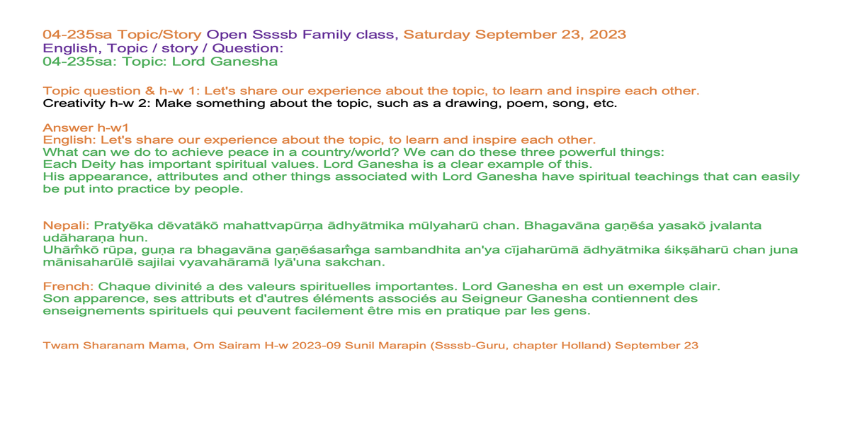 | 04-235sa Sept 23, 2023. | About Lord Ganesha | Let's share our experiences and insights through words and/or creative expression, such as art, poetry, music, drama, or drawings, to inspire each other. | Ssssb-guru Daju (Sunil Marapin). Support team: Gurus and Youth team | Nepal 09:00 - 10:15, Congo 4:15-5:30, India 8:45-10:00, Holland 5:15-6:30, Bangladesh 09:15 - 10:13, Qatar 06:15-07:30 | Saturday Family class for everyone | |