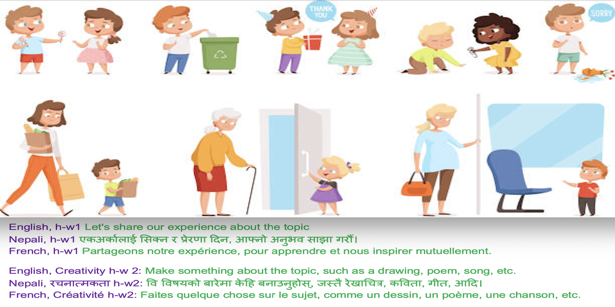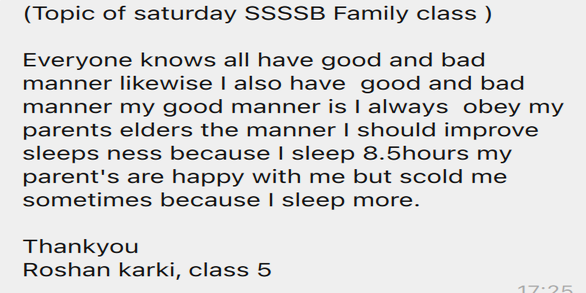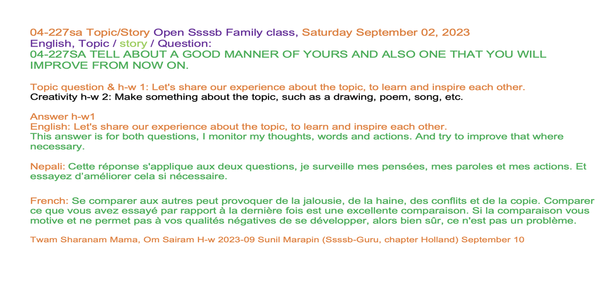 | 04-227sa Sept 02, 2023. | Tell about a good manner of yours and also one that you will improve from now on. | Let's share our experiences and insights through words and/or creative expression, such as art, poetry, music, drama, or drawings, to inspire each other. | Ssssb-guru Daju (Sunil Marapin). Support team: Gurus and Youth team | Nepal 09:00 - 10:15, Congo 4:15-5:30, India 8:45-10:00, Holland 5:15-6:30 | Saturday Family class | |