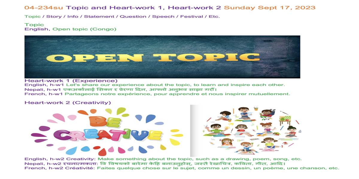 | 04-234su Sunday Sept 17, 2023 | Open Topic | Let's share our experiences and insights through words and/or creative expression, such as art, poetry, music, drama, or drawings, to inspire each other. | Ssssb-guru Daju (Sunil Marapin). Support team: Gurus and Youth team | Congo 14:00- 15:15, India 18:30-19:45 Nepal: 18:45-20:00, Holland 15:00-16:15, Bangladesh 19:00-20:15, Qatar 16:00-17:00 | Sunday Family class | |