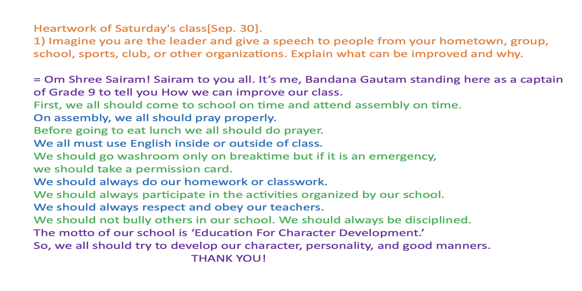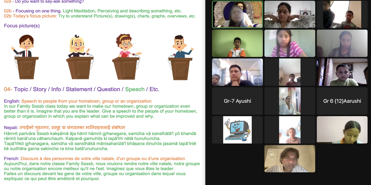 | 04-237sa Sept 30, 2023. | Speech to people from your hometown, group or an organization | Let's share our experiences and insights through words and/or creative expression, such as art, poetry, music, drama, or drawings, to inspire each other. | Ssssb-guru Daju (Sunil Marapin). Support team: Gurus and Youth team | Nepal 09:00 - 10:15, Congo 4:15-5:30, India 8:45-10:00, Holland 5:15-6:30, Bangladesh 09:15 - 10:13, Qatar 06:15-07:30 | Saturday Family class for everyone | |
