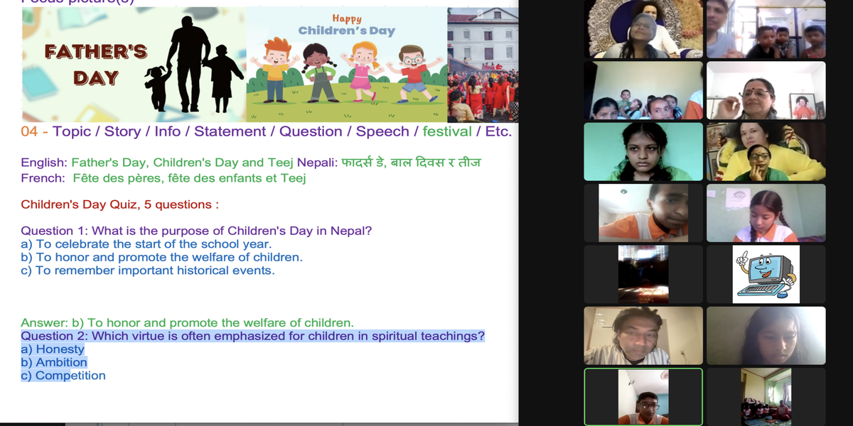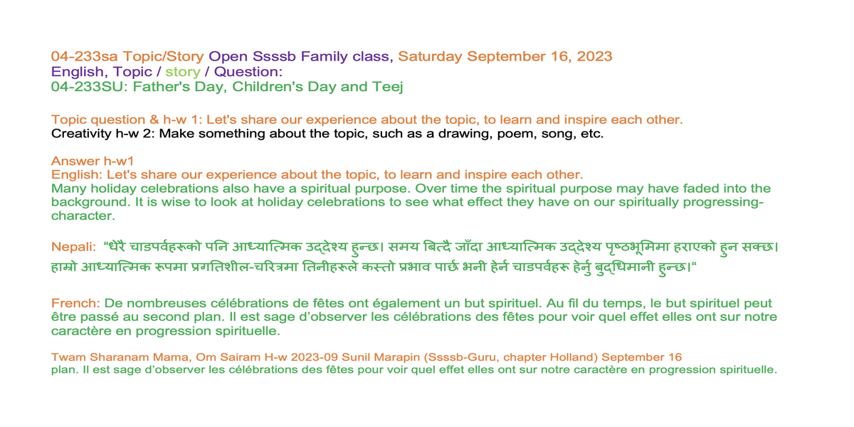 | 04-233sa Sept 16, 2023. | Father's Day, Children's Day and Teej | Let's share our experiences and insights through words and/or creative expression, such as art, poetry, music, drama, or drawings, to inspire each other. | Ssssb-guru Daju (Sunil Marapin). Support team: Gurus and Youth team | Nepal 09:00 - 10:15, Congo 4:15-5:30, India 8:45-10:00, Holland 5:15-6:30, Bangladesh 09:15 - 10:13, Qatar 06:15-07:30 | Saturday Family class | |