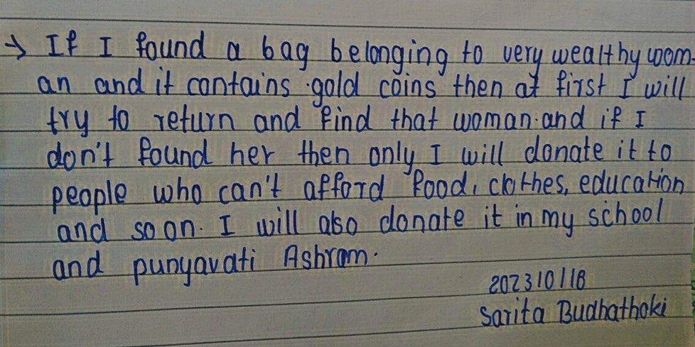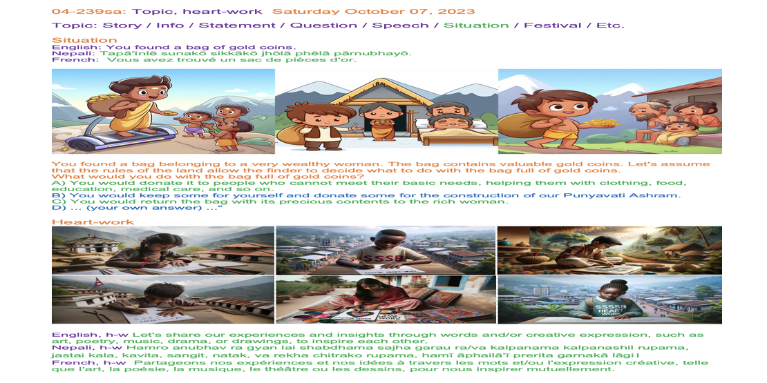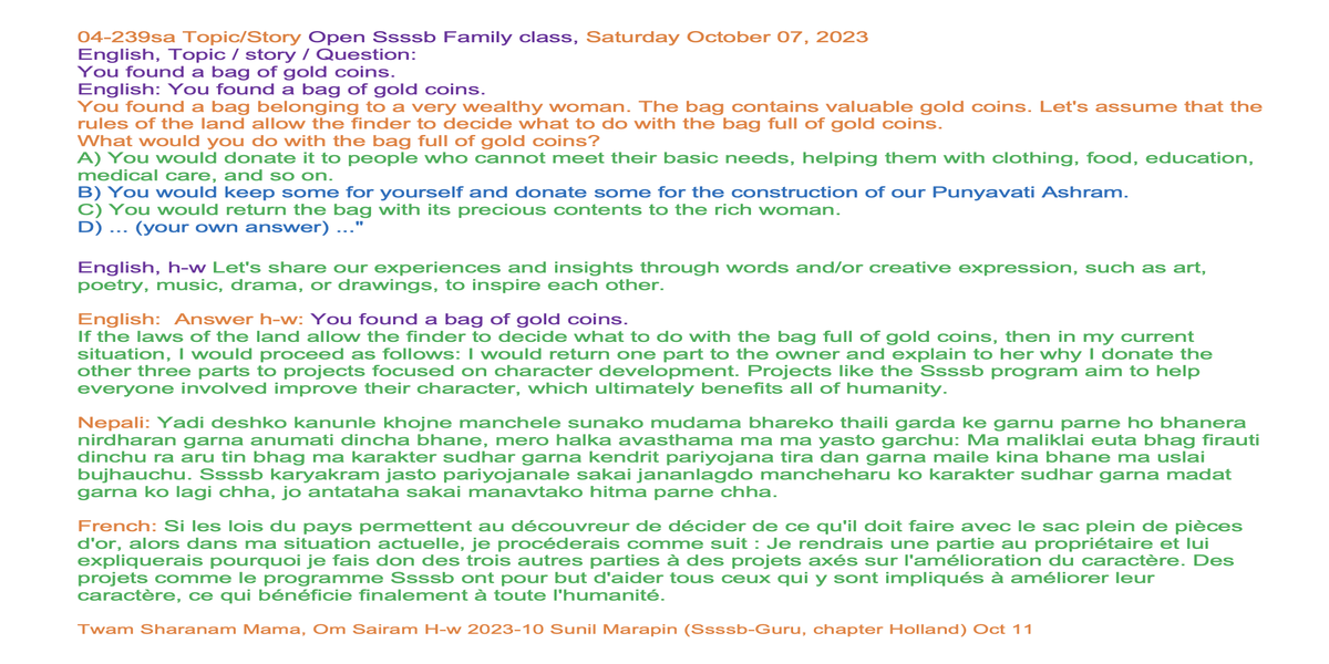 | 04-239sa Oct 07, 2023. | You found a bag of gold coins. | Let's share our experiences and insights through words and/or creative expression, such as art, poetry, music, drama, or drawings, to inspire each other. | Ssssb-guru Daju (Sunil Marapin). Support team: Gurus and Youth team | Nepal 09:00 - 10:15, Congo 4:15-5:30, India 8:45-10:00, Holland 5:15-6:30, Bangladesh 09:15 - 10:13, Qatar 06:15-07:30 | Saturday Family class for everyone | |