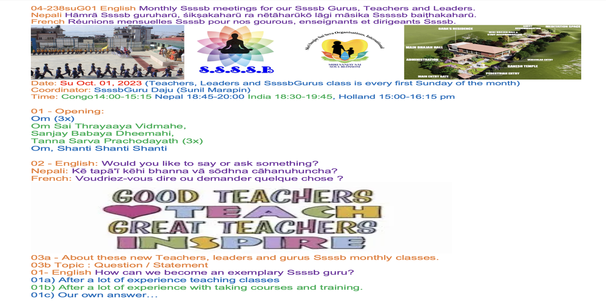 | 04-238suG01 Oct 01, 2023. | First Gurus class: How can we become an exemplary Ssssb guru? | Let's share our experiences and insights through words and/or creative expression, such as art, poetry, music, drama, or drawings, to inspire each other. | Ssssb-guru Daju (Sunil Marapin). Support team: Gurus and Youth team | Congo 14:00- 15:15, India 18:30-19:45 Nepal: 18:45-20:00, Holland 15:00-16:15 | Sunday class for Gurus. | First Gurus class. |
