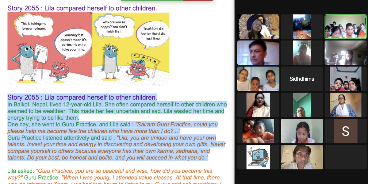 | 04-230sa Sept 09, 2023. | Story 2055: Lila compared herself to other children. | Let's share our experiences and insights through words and/or creative expression, such as art, poetry, music, drama, or drawings, to inspire each other. | Ssssb-guru Daju (Sunil Marapin). Support team: Gurus and Youth team | Nepal 09:00 - 10:15, Congo 4:15-5:30, India 8:45-10:00, Holland 5:15-6:30, Bangladesh 09:15 - 10:13, Qatar 06:15-07:30 | Saturday Family class | |
