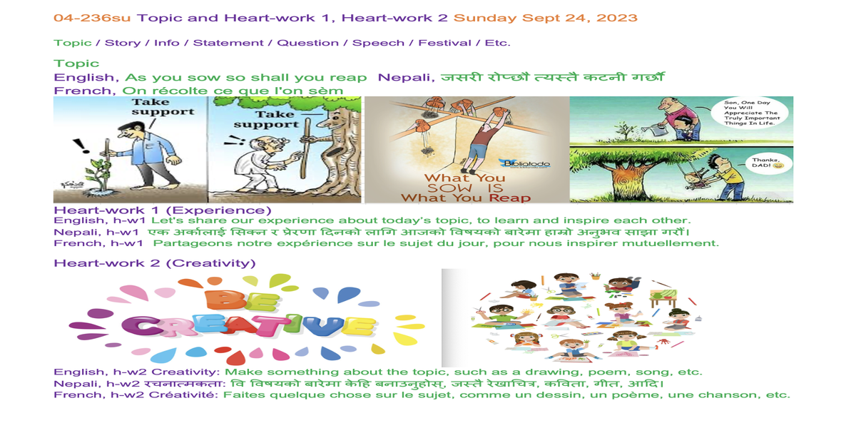 | 04-236su Sunday Sept 24, 2023 | Topic: As you sow so shall you reap | Let's share our experiences and insights through words and/or creative expression, such as art, poetry, music, drama, or drawings, to inspire each other. | Ssssb-guru Daju (Sunil Marapin). Support team: Gurus and Youth team | Congo 14:00- 15:15, India 18:30-19:45 Nepal: 18:45-20:00, Holland 15:00-16:15, Bangladesh 19:00-20:15, Qatar 16:00-17:00 | Sunday Family class for everyone | |