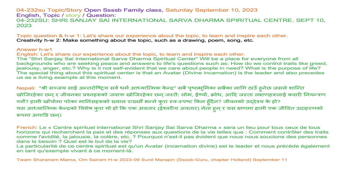| 04-232su Sunday Sept 10, 2023 | Shri Sanjay Sai International Sarva Dharma Spiritual Centre. | Let's share our experiences and insights through words and/or creative expression, such as art, poetry, music, drama, or drawings, to inspire each other. | Ssssb-guru Daju (Sunil Marapin). Support team: Gurus and Youth team | Congo 14:00- 15:15, India 18:30-19:45 Nepal: 18:45-20:00, Holland 15:00-16:15, Bangladesh 19:00-20:15, Qatar 16:00-17:00 | Sunday Family class | |