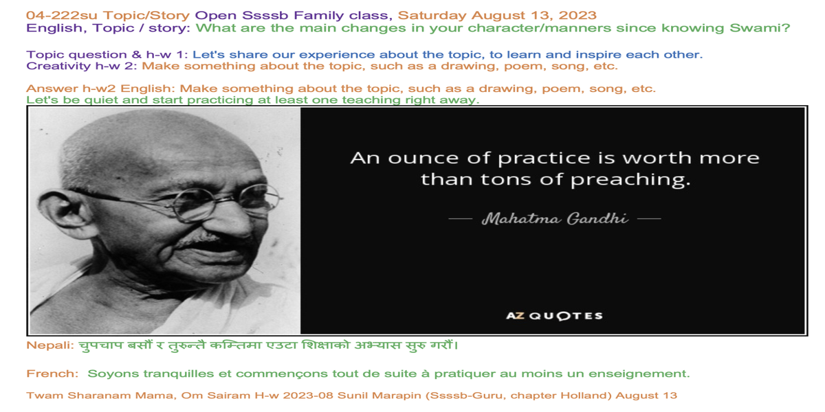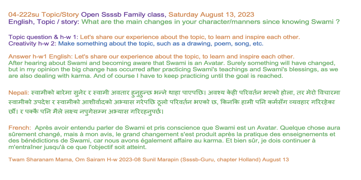 | 04-222su August 13, 2023 | What are the main changes in your character/manners since knowing Swami | Let's share our experiences and insights through words and/or creative expression, such as art, poetry, music, drama, or drawings, to inspire each other. | Ssssb-guru Daju (Sunil Marapin). Support team: Gurus and Youth team | Nepal 18:45-20:00, India 18:30-19:45, Congo: 14:00-15:15, Holland 15:00-16:15, Qatar 16:00-17:15 | Sunday Family class | |