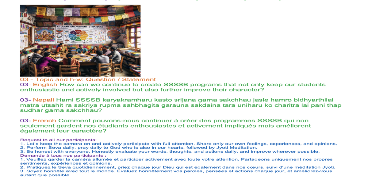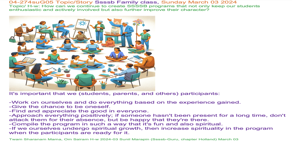 | 04-274su March 03 | How can we continue to create SSSSB programs that not only keep our students enthusiastic and actively involved but also further improve their character? | Let's share our experiences and insights through words and/or creative expression, such as art, poetry, music, drama, or drawings, to inspire each other. | Ssssb-guru Daju (Sunil Marapin) | Nepal 18:45-20:00, India 18:30-19:45, Congo: 14:00-15:15, Holland 14:00-15:15 | 5th Gurus class |