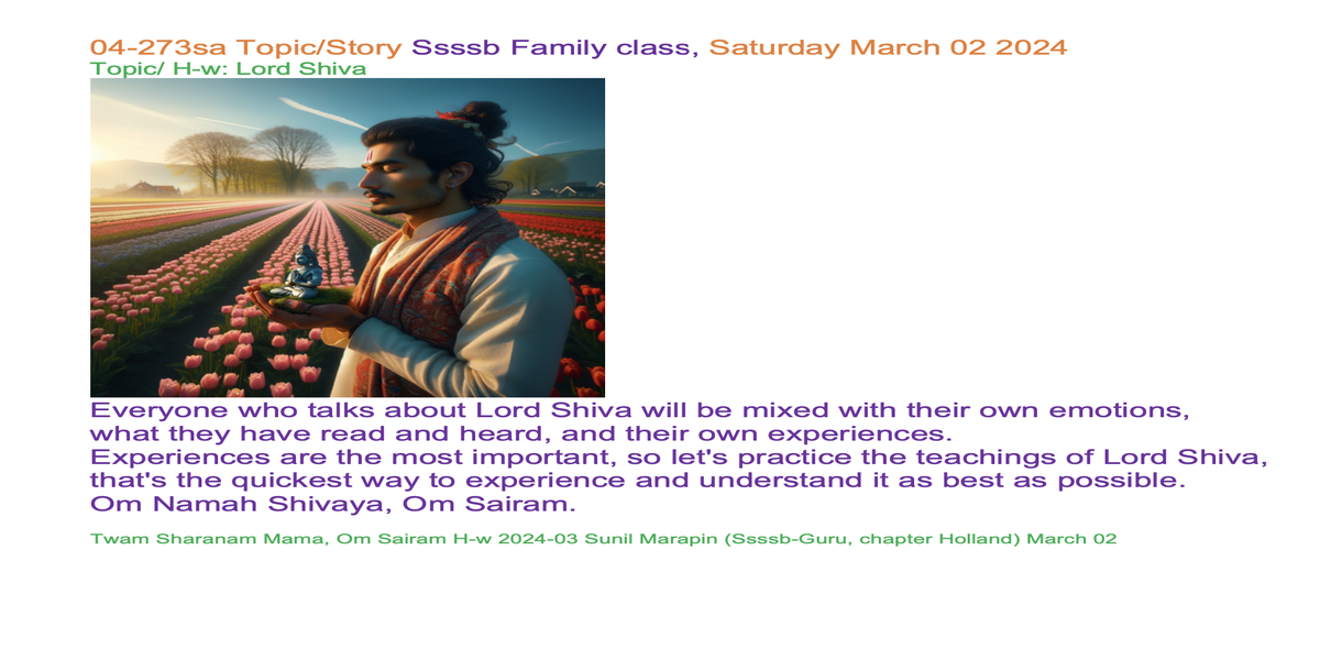 | 04-273sa March 02 | Lord Shiva | Let's share our experiences and insights through words and/or creative expression, such as art, poetry, music, drama, or drawings, to inspire each other. | Ssssb-guru Daju (Sunil Marapin) Support team: Gurus and Youth team | Nepal 09:00 - 10:15, Congo 4:15-5:30, India 8:45-10:00, Holland 4:15-5:30 | Saturday Family class for everyone |