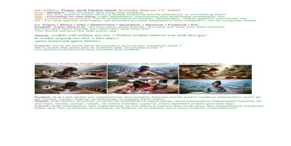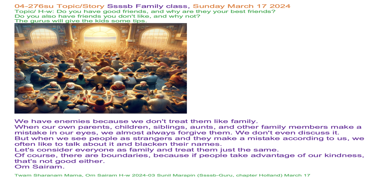 | 04-276su March 17 | Do you have good friends, and why are they your best friends? Do you also have friends you don't like, and why not? The mentors will give the kids some tips. | Let's share our experiences and insights through words and/or creative expression, such as art, poetry, music, drama, or drawings, to inspire each other. | Ssssb-guru Daju (Sunil Marapin) Support team: Gurus and Youth team | Nepal 18:45-20:00, India 18:30-19:45, Congo: 14:00-15:15, Holland 14:00-15:15 | Sunday Family class for everyone |