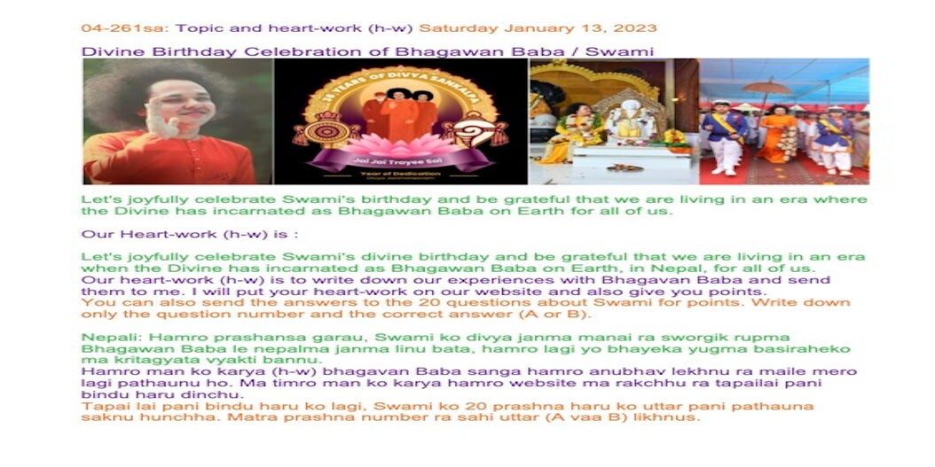 | 04-261sa Jan 13, 2024 | Divine Birthday Celebration of Bhagawan Baba / Swami | Let's share our experiences and insights through words and/or creative expression, such as art, poetry, music, drama, or drawings, to inspire each other. | Ssssb-guru Daju (Sunil Marapin). Support team: Gurus and Youth team | Nepal 09:00 - 10:15, Congo 4:15-5:30, India 8:45-10:00, Holland 4:15-5:30, Qatar 06:15-07:30 | Saturday Family class for everyone |