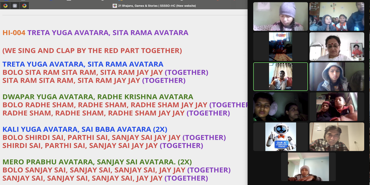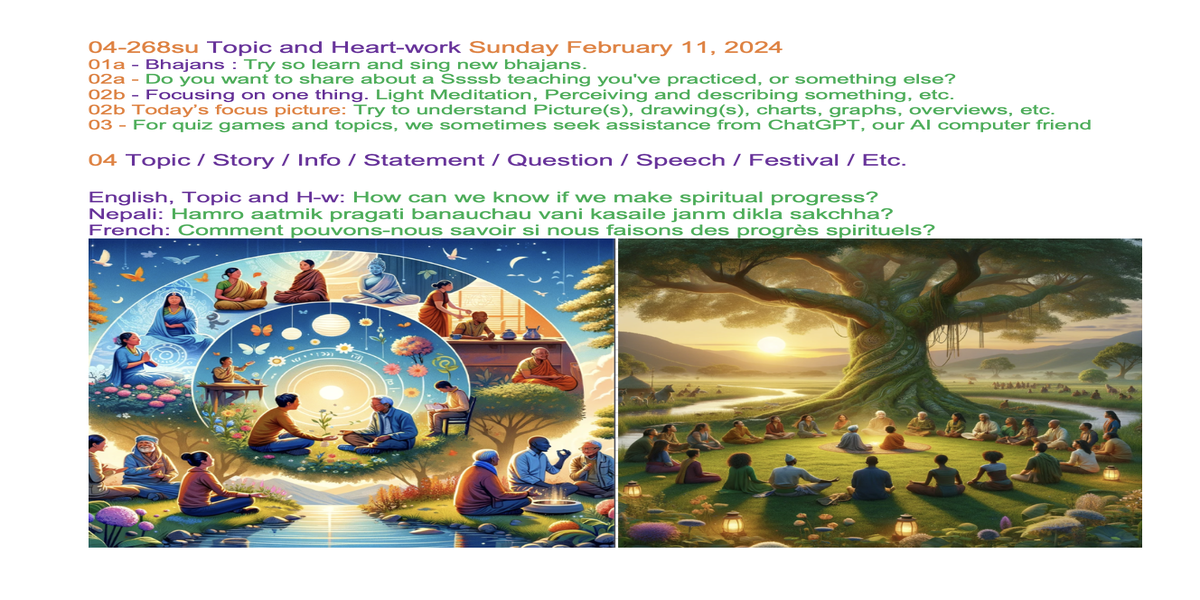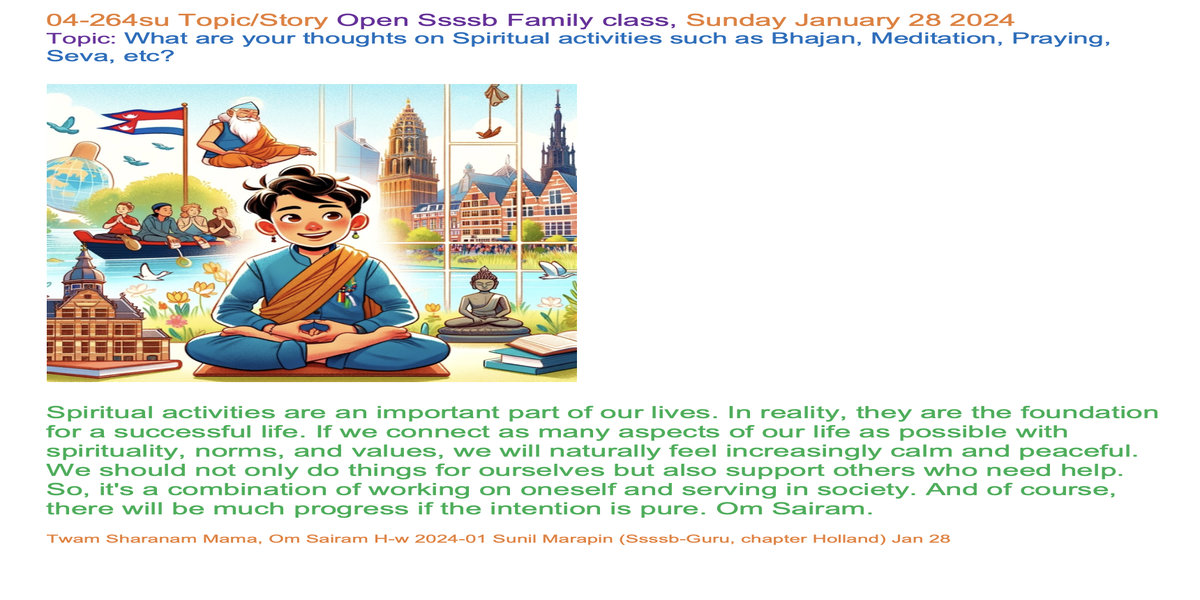 | 04-264su Jan 28, 2024 | What are your thoughts on Spiritual activities such as Bhajan, Meditation, Praying, Seva, etc? | Let's share our experiences and insights through words and/or creative expression, such as art, poetry, music, drama, or drawings, to inspire each other. | Ssssb-guru Daju (Sunil Marapin). Support team: Gurus and Youth team | Nepal 18:45-20:00, India 18:30-19:45, Congo: 14:00-15:15, Holland 14:00-15:15, Qatar 16:00-17:15 | Sunday Family class for everyone |
